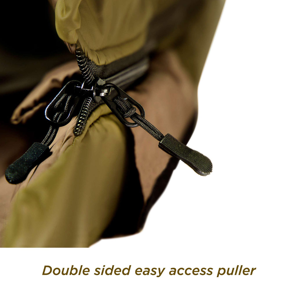 - Dragkedja på hela sidan med skjutreglage med dubbla handtag med dragrör för att låsa in värmen