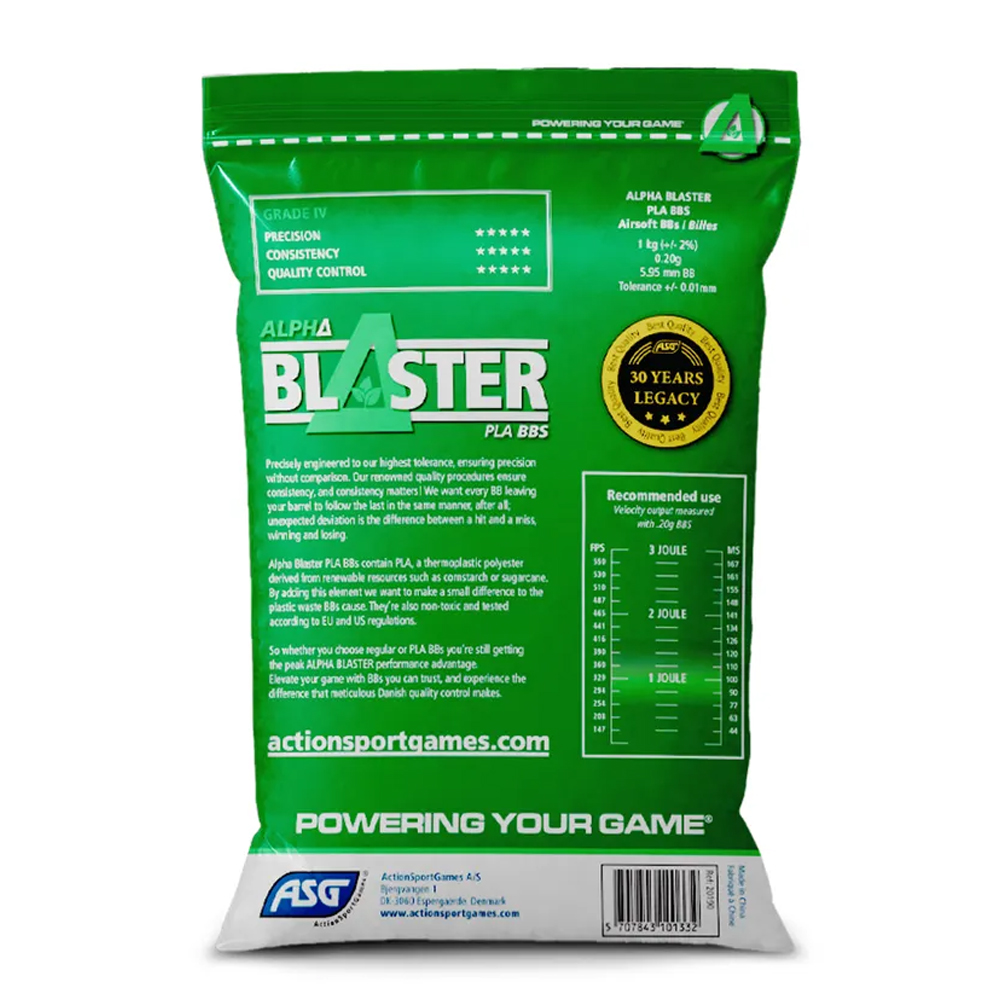 Alpha Blaster PLA BBs 0.20g är det självklara valet för airsoftspelare som söker lättare och jämnviktade kulor med stabil flygbana. Kulorna är tillverkade av biologiskt nedbrytbar PLA-plast, vilket gör dem både miljövänliga och effektiva. Deras släta yta minimerar risken för matningsproblem i både AEG, GBB och HPA-system. En utmärkt allround-kula för träning, tävling eller casual-spel. Levereras i praktisk 1 kg påse.