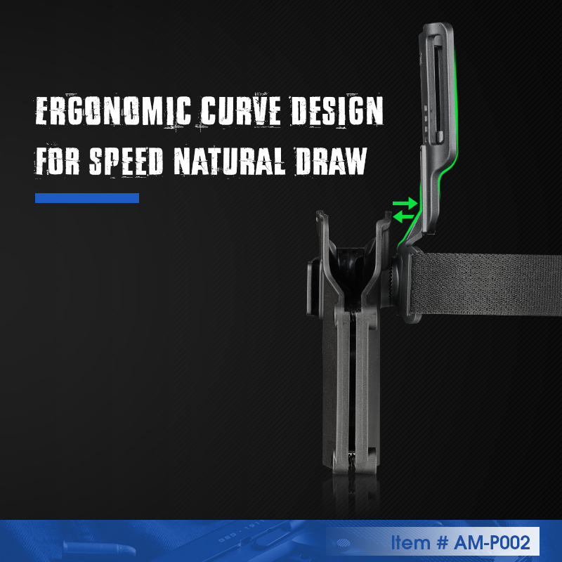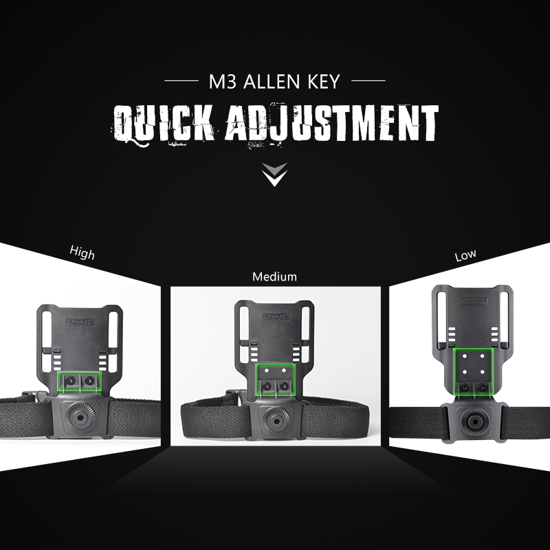Den låga körningsförlusten kan fästas på alla Amomax taktiska produkter inklusive Per-Fit-hölster, alla taktiska hölster etc. Den stöder tandväxelanslutning för 360-graders rotation.