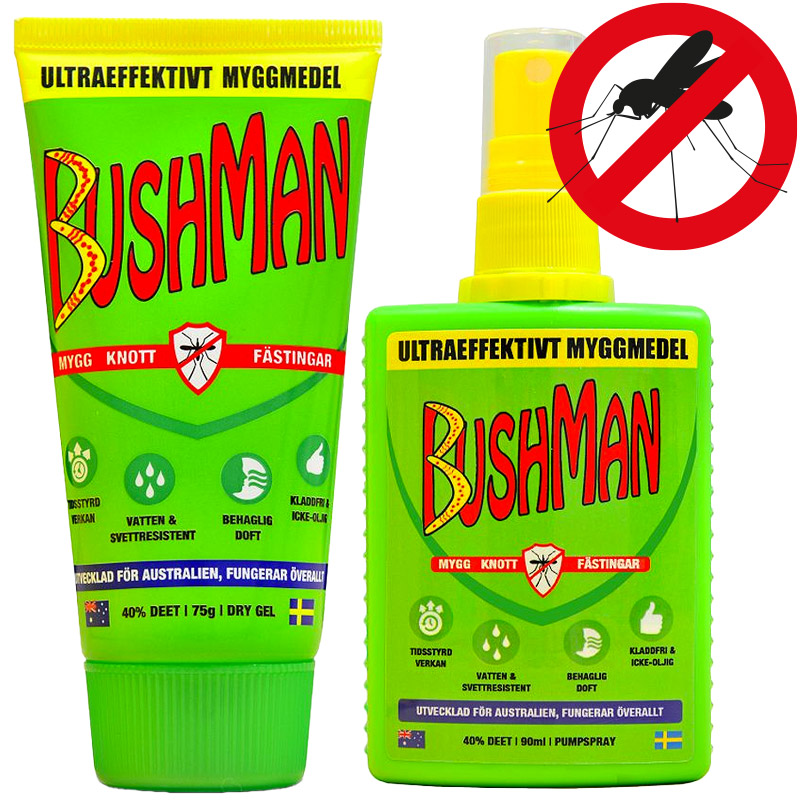 Bushman gel är skonsam mot huden, har en behaglig och neutral doft, och innehåller allergifria ingredienser. Den aktiva ingrediensen i Bushman är DEET, vilken rekommenderas av Världshälsoorganisationen som det mest effektiva myggskyddet på marknaden. DEET utvecklades i USA som skydd mot insektsburna sjukdomar i tropiska miljöer, och är godkänt för användning i Sverige av Kemikalieinspektionen. Bushman ger ett långvarigt skydd mot insekter som mygg, knott, fästingar, flugor och andra luftburna insekter, upp till 15 timmar
