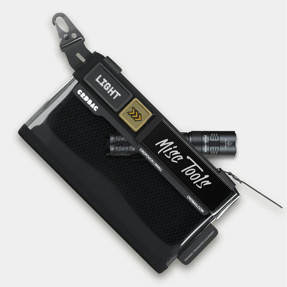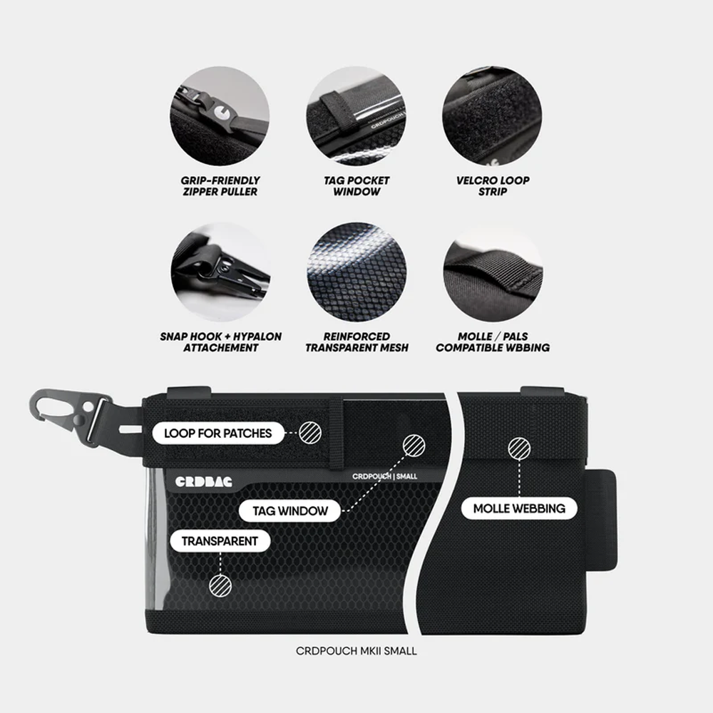 CRDPOUCH Liten är en praktisk och hållbar väska för effektiv förvaring och organisering av kamerautrustning. Med genomskinligt meshfönster, kardborrepanel och MOLLE-kompatibilitet.