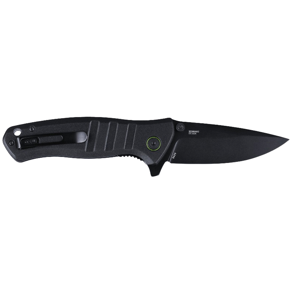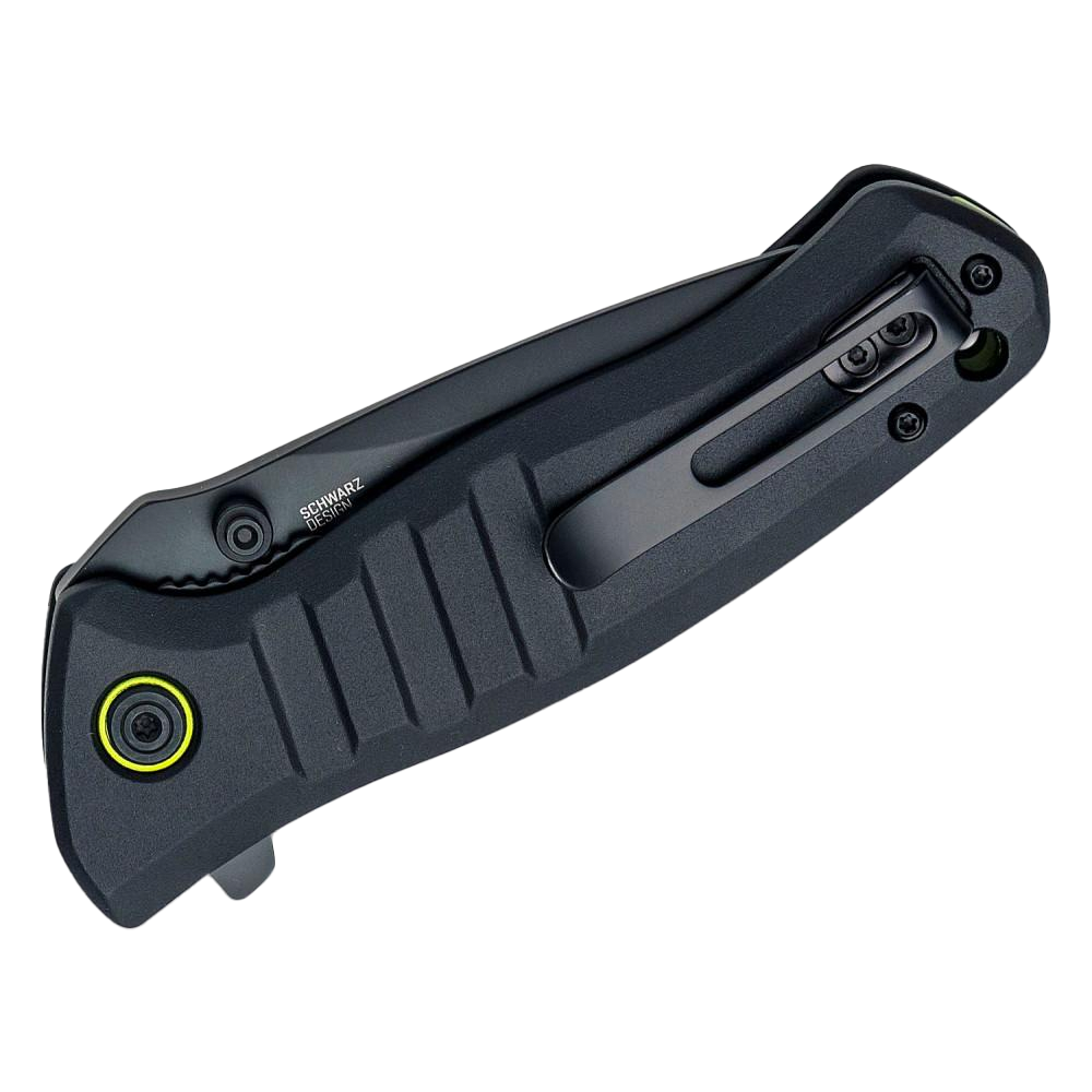 - På knivens baksida finns ett svart pocket clip av rostfritt stål, tip up carry.