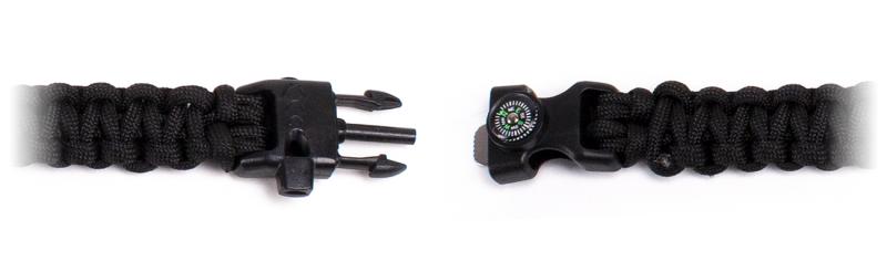 Spännet är också multifunktionellt. Det kan användas som en vissla, kompass och flinta. Armbandet ger 3 meter paracord.