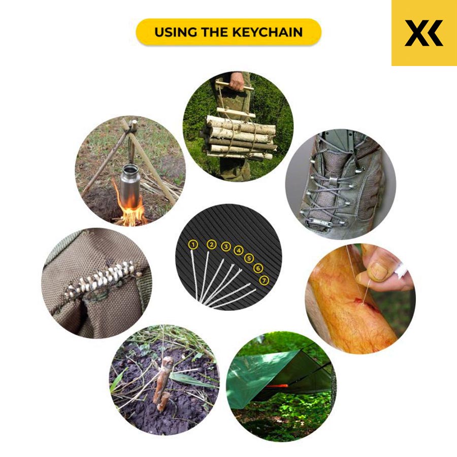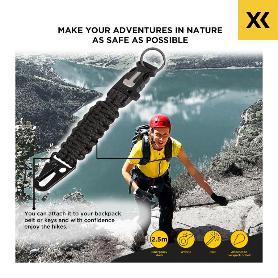 Vår paracord -nyckelring innehåller fem överlevnadsverktyg för att göra camping, jakt eller vandring säkrare: