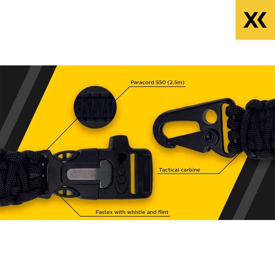 Material: 550 paracord, rostfri karbinhake och nyckelring, fastex och acetal visselpipa, flintstång och skrapa