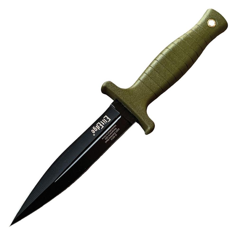 ElitEdge Boot Knife Desert Green är en kompakt och lätt dolk designad för diskret bärande och snabb åtkomst. Med sin smala profil och praktiska storlek är den enkel att bära i stövel, bälte eller som en del av taktisk utrustning. Kniven har en 4,63 tum lång dubbelslipad klinga i rostfritt stål med svart finish. Den spetsiga dolkdesignen ger god penetrationsförmåga och gör kniven lämplig för olika typer av precisionsarbete. Handtaget är tillverkat i slitstark grön nylon som ger ett stabilt grepp och låg vikt. I änden av handtaget finns ett praktiskt hål för säkerhetslina (lanyard). Kniven levereras med en robust svart nylonslida som enkelt kan fästas i bälte eller utrustning. ElitEdge Boot Knife är ett smidigt och funktionellt verktyg som passar för friluftsliv, samling eller taktisk utrustning.