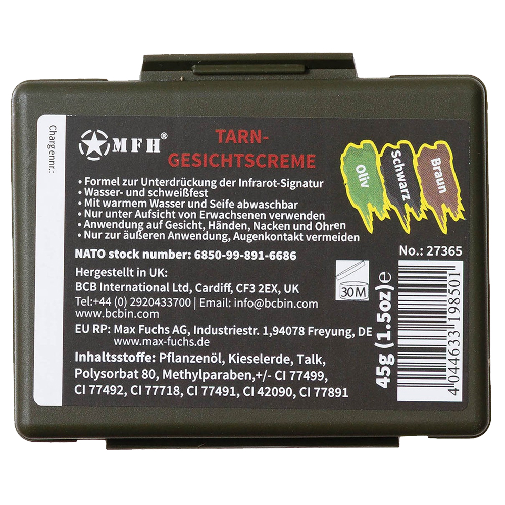 GB Camo Face Paint är en professionell kamouflagefärg framtagen för militärt bruk, airsoft, jakt och friluftsliv. Förpackningen innehåller tre klassiska färger — svart, grön och brun — som kan blandas för naturliga nyanser. Färgen är svettresistent, infraröd-icke-reflekterande och har hög solskyddsfaktor, vilket gör den idealisk för långa dagar i fält. Förpackningen är kompakt och robust med inbyggd spegel för enkel applicering i fält. Färgen avlägsnas enkelt med varmt vatten och tvål.
