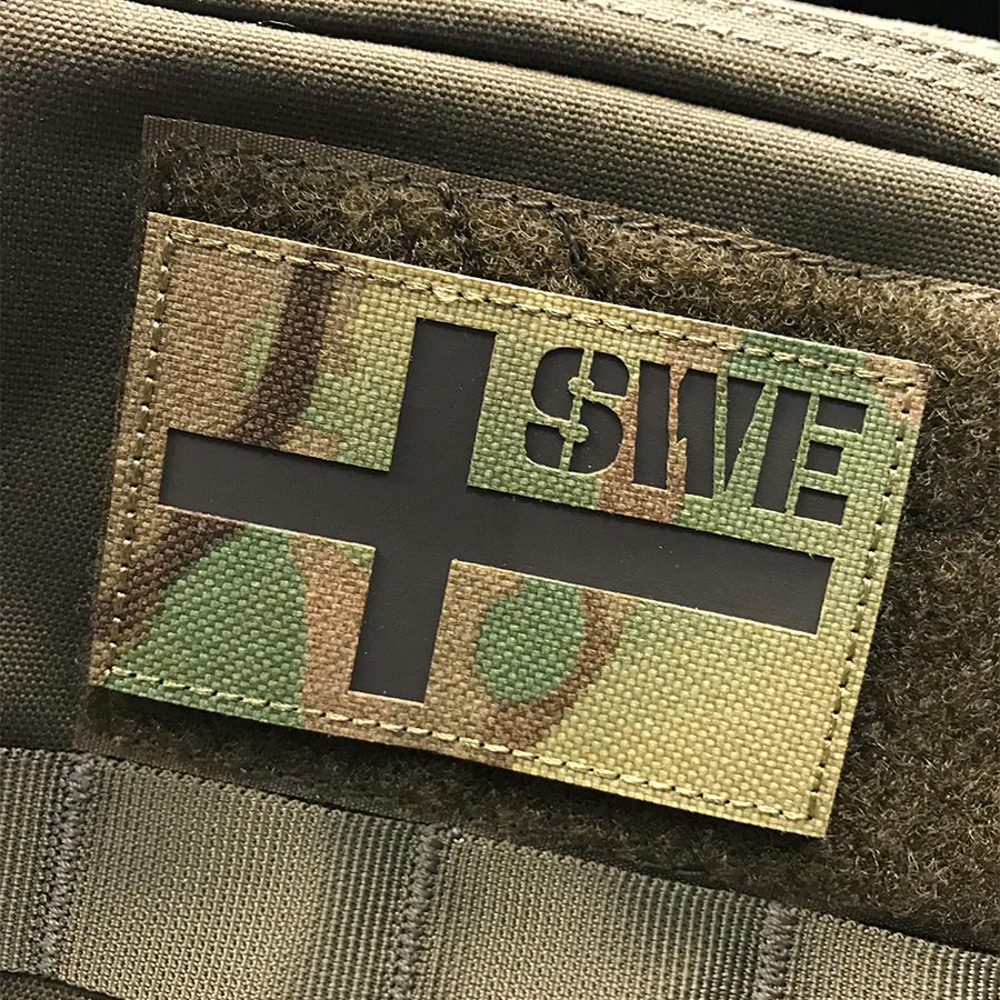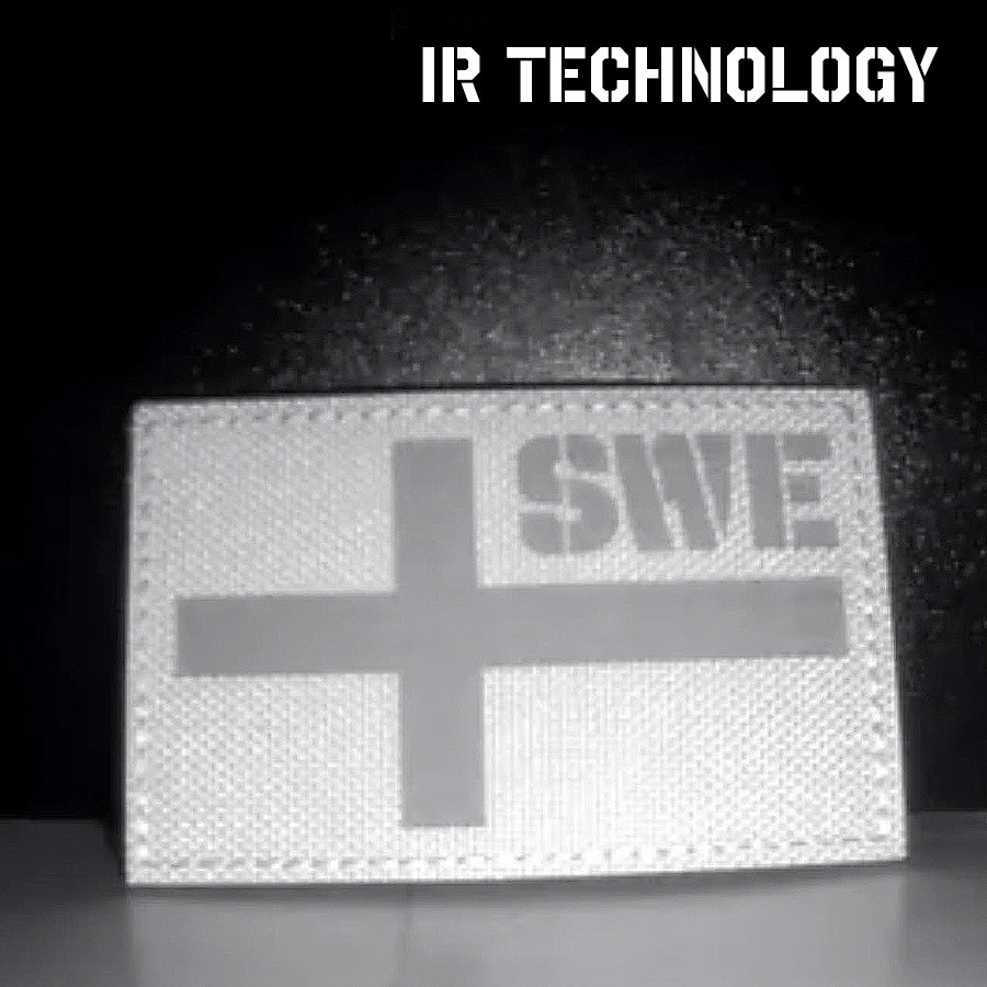 Med texten SWE och Operational (Multicam) kamouflage som bakgrund. När man tittar med IR kikare så lyser den i mörkret vilket gör det väldigt effektivt att hålla koll på sina egna.