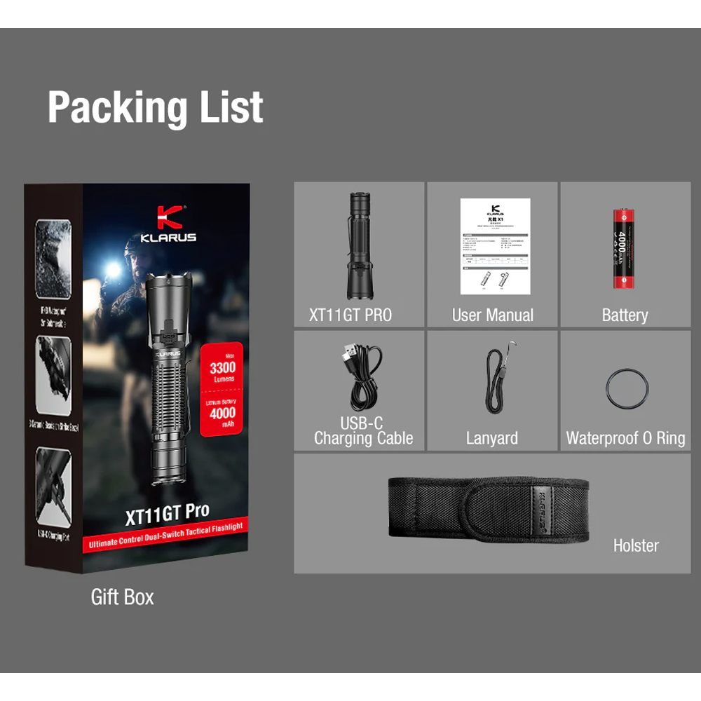 - Klarus patenterade 5:e generations Dual Switch knapp, kommer med USB-C snabbladdning och är vattentålig (IPX8).