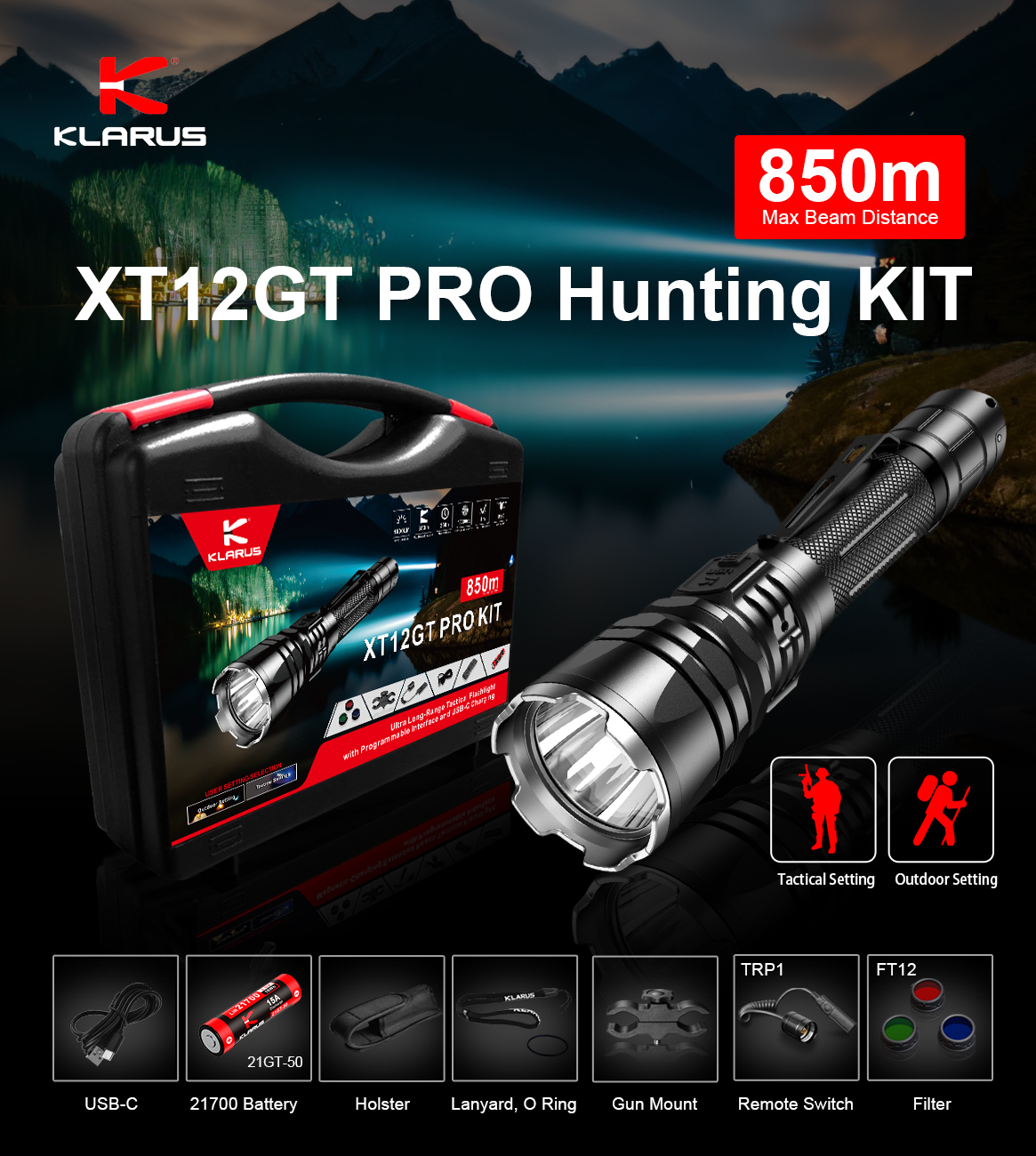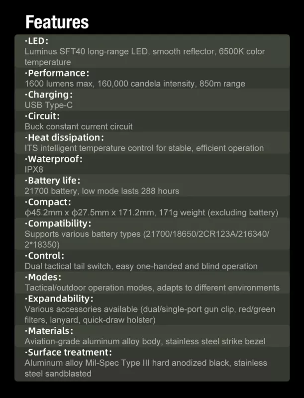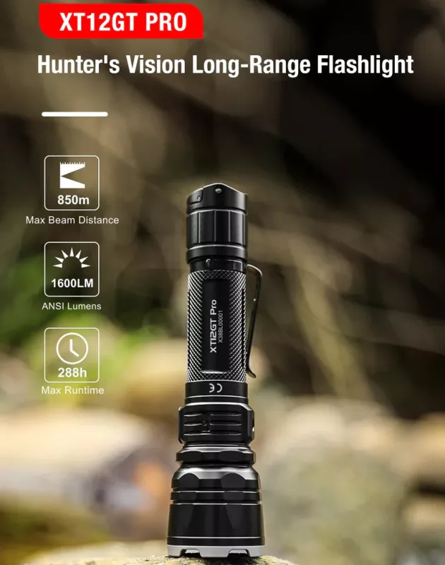 850-meter beam distance / 1600-lumen brightness / 288-hour runtime.