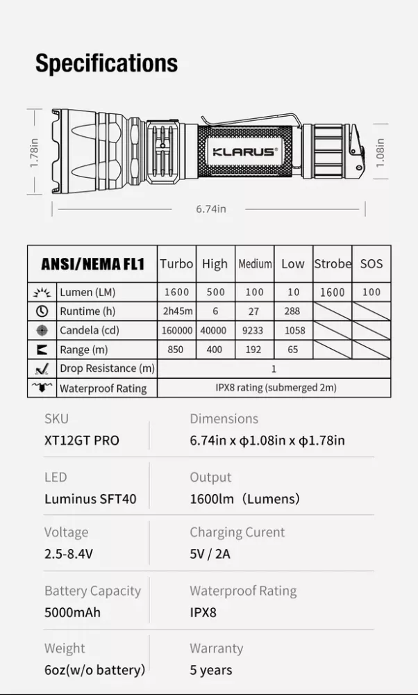 Klarus XT12GT PRO Long Throw Tactical Flashlight
