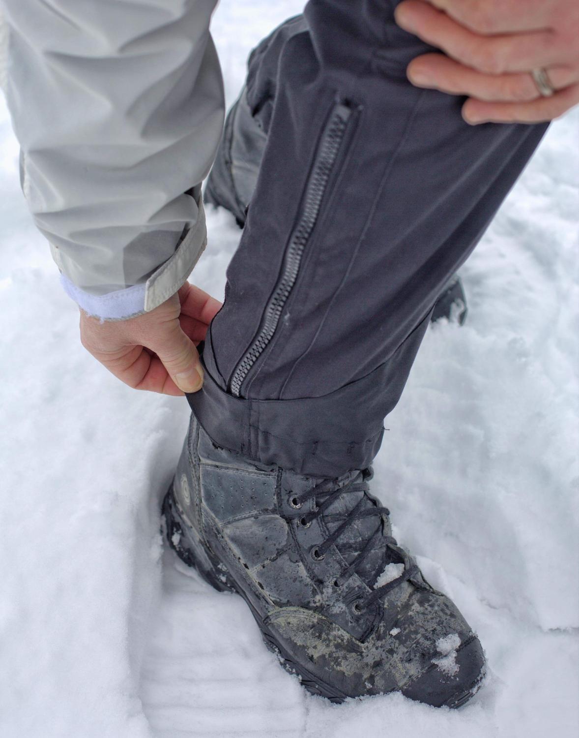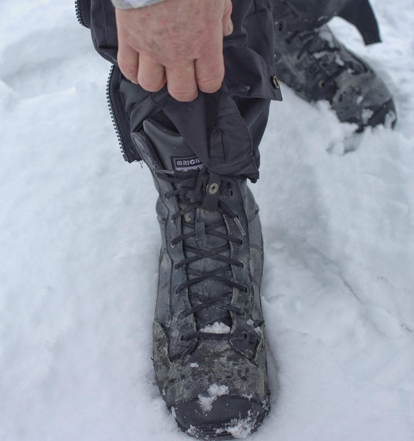- Kraftig stropp för att fästa byxan i kängan, och en polyesterkappa nertill för att stå emot smuts och väta.