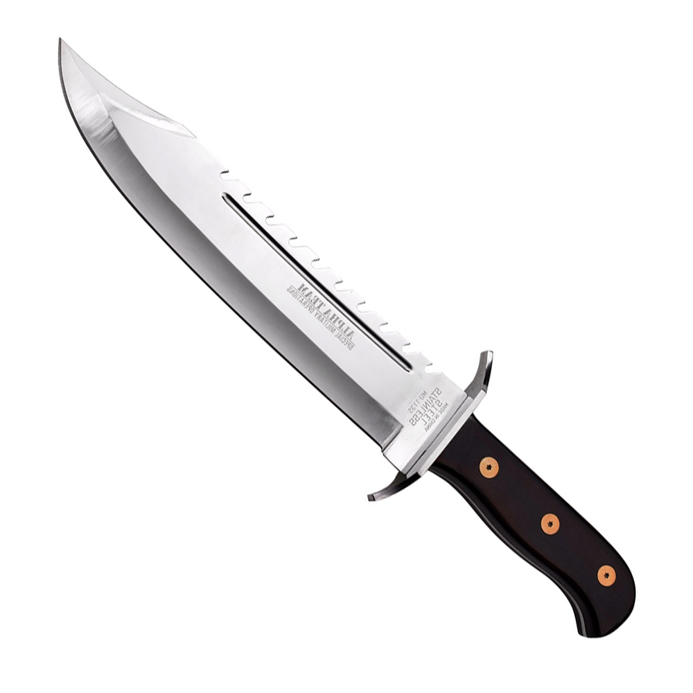 Master USA MU-1135S är en massiv fastbladskniv designad för tuffa utomhusförhållanden. Med en total längd på över 41 cm kombinerar denna bowiekniv styrka, balans och ett aggressivt utseende. Bladet är tillverkat i 3Cr13 rostfritt stål med spegelpolerad, delvis sågtandad egg – idealiskt för både skärande och sågande arbete.