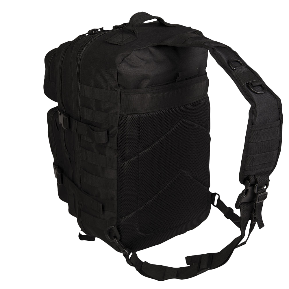 Mil-Tec har nu äntligen lanserat assault packen som en sling pack som alltså bärs upp av av en ordentlig axelrem på överkroppen.
