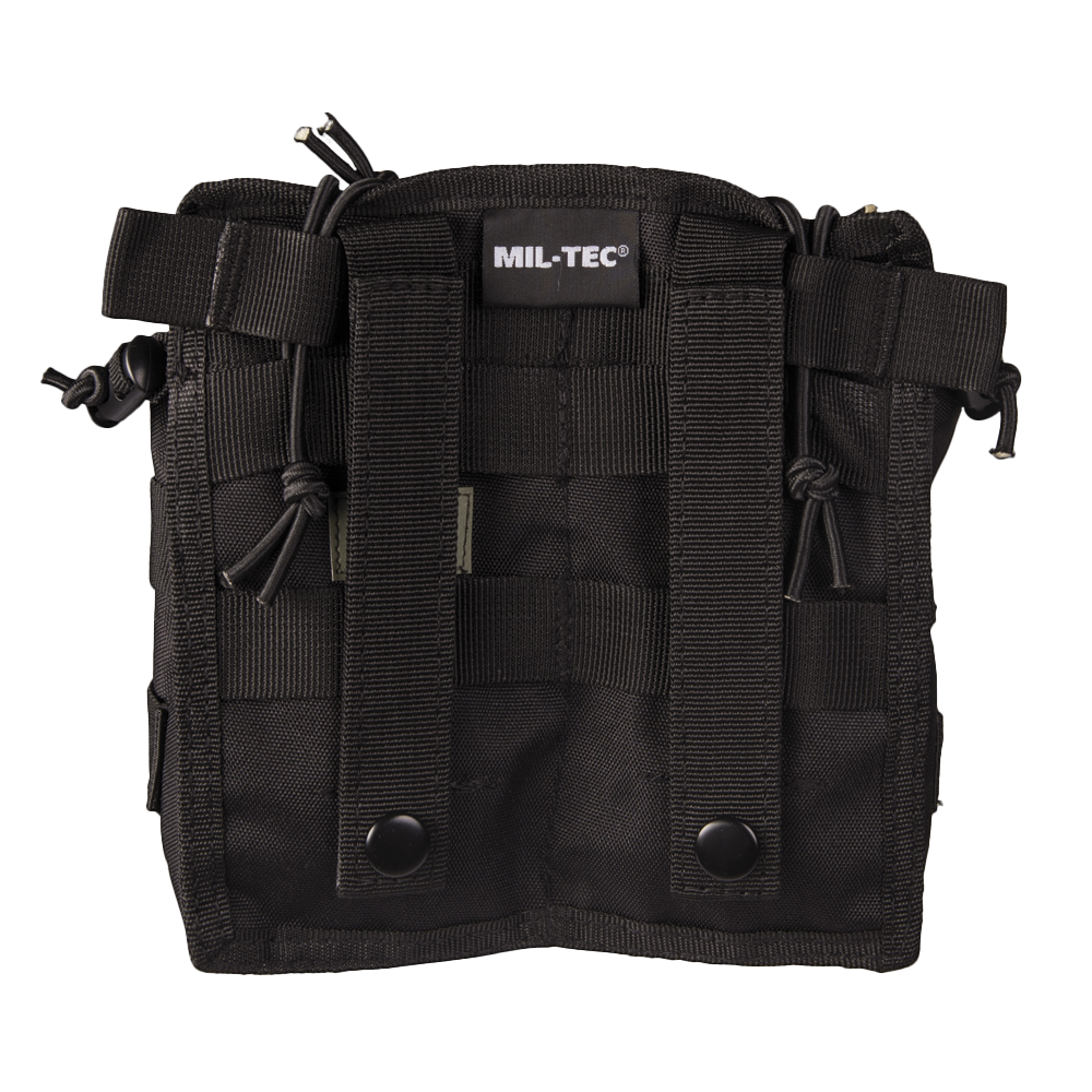 Bandet dras åt med en snörstopp för att anpassa storleken och passformen. Fickan rymmer två magasin och kan fästas med Molle-fäste på din ryggsäck. Det finns även mollesystem på magasinfickans framsida.