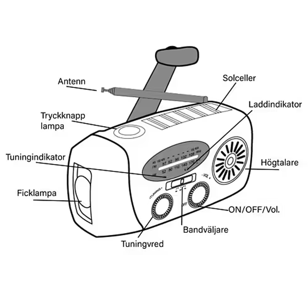 Denna nödradio med vev är ett praktiskt och mångsidigt verktyg för både friluftsliv och nödsituationer. Den kombinerar radio, ficklampa och powerbank i en kompakt enhet som är enkel att ha med i ryggsäcken, bilen eller krislådan.