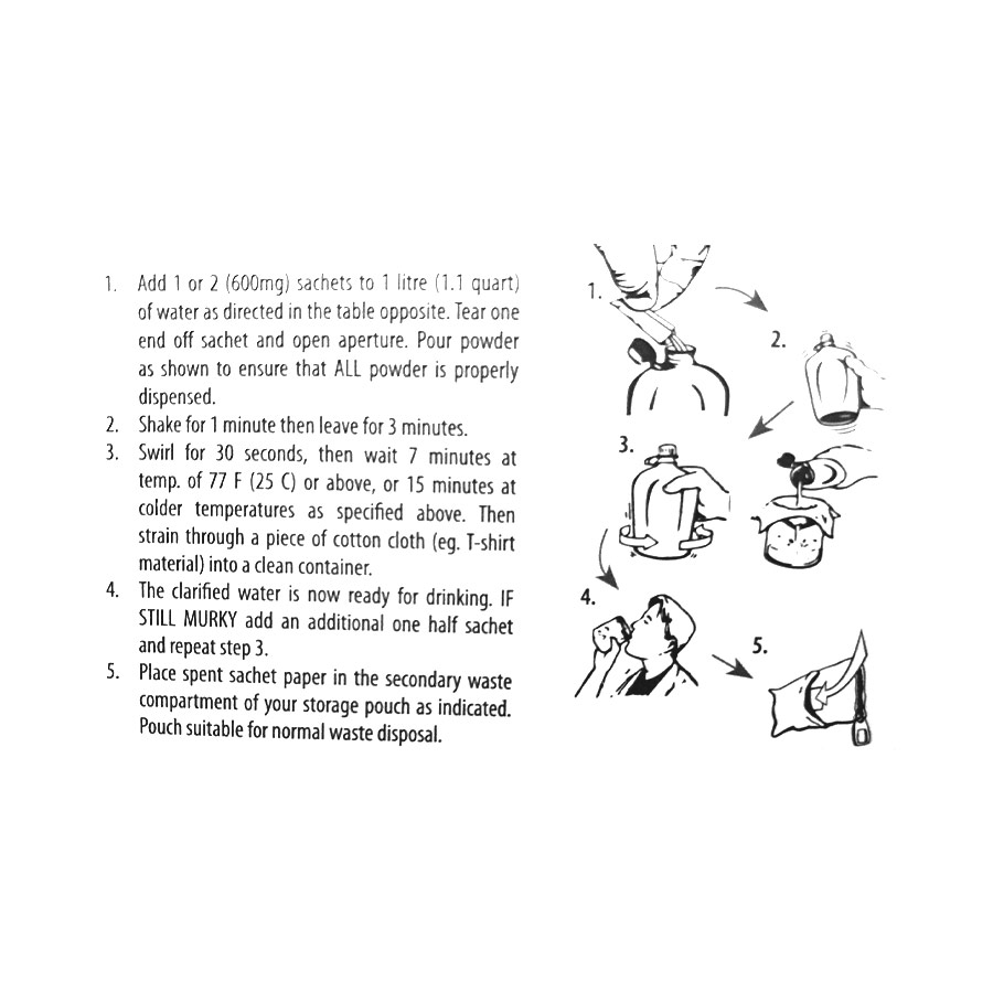 En påse på 600 milligram ger 1,4 % tillgängligt klor och flockningsmedel för KLARNING OCH DESINFEKTION AV 1 LITER (1,10 quart) VATTEN FRÅN FÖRORENADE KÄLLOR VID TEMPERATUR AV 25 grader C (77 fahrenheit) : vid 5 grader C (41 fahrenheit) ger 2,8 % tillgängligt klor för samma ändamål.