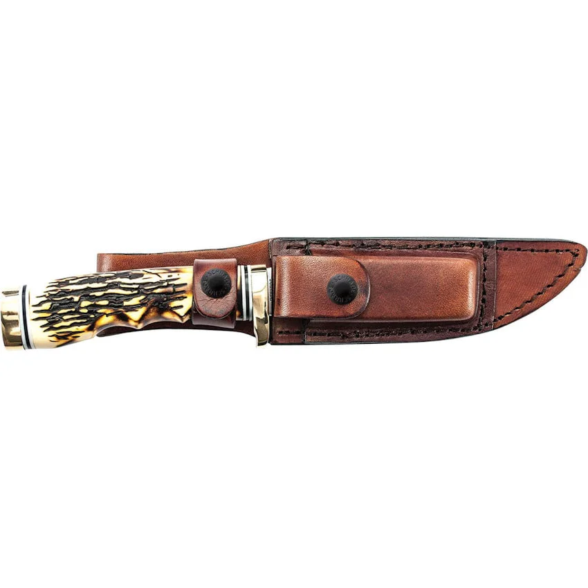 Staglonhandtag med Nickel Silver Guard och Pommel, och brunt läderbälteshylsa med slipsten.