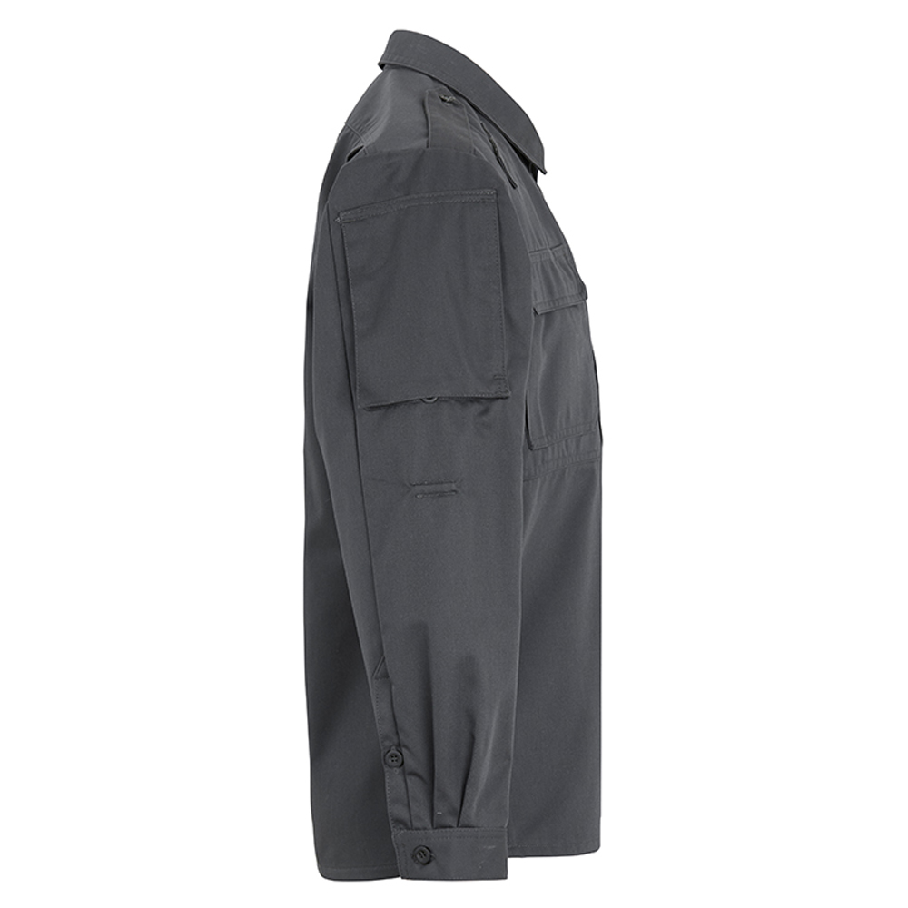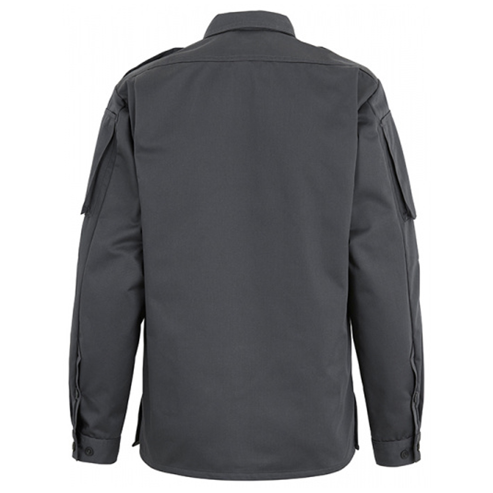 Den grå skjortjackan är designad specifikt för väktare och säkerhetspersonal. Den kombinerar en professionell look med genomtänkt funktionalitet. De täckande bröstfickorna har blixtlås och utanpåliggande bälgfickor med lock – höger ficklock har namnbrickshållare och öppning för penna. Invändigt finns mobilficka och knapphål för öronsnäcka. Vänster ficka har fäste för passerkort eller ID. Ärmarna kan vikas upp med knäpptamp, och båda ärmarna har extra fickor med blixtlås i sidan. Kragen justeras med kardborre, och slitsarna i sidorna ger extra rörelsefrihet. Tillverkad i tålig varpsatin med vatten-, smuts- och oljeavvisande behandling – perfekt för yrkesbruk.