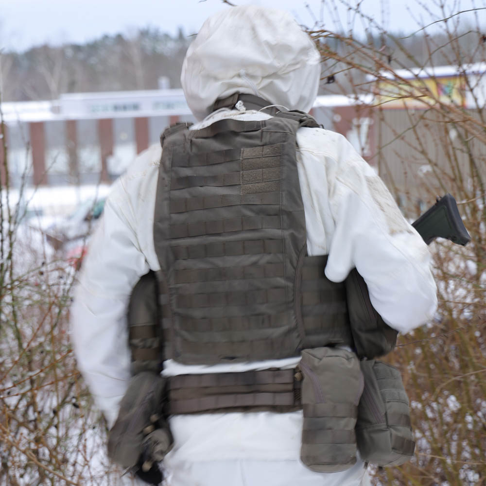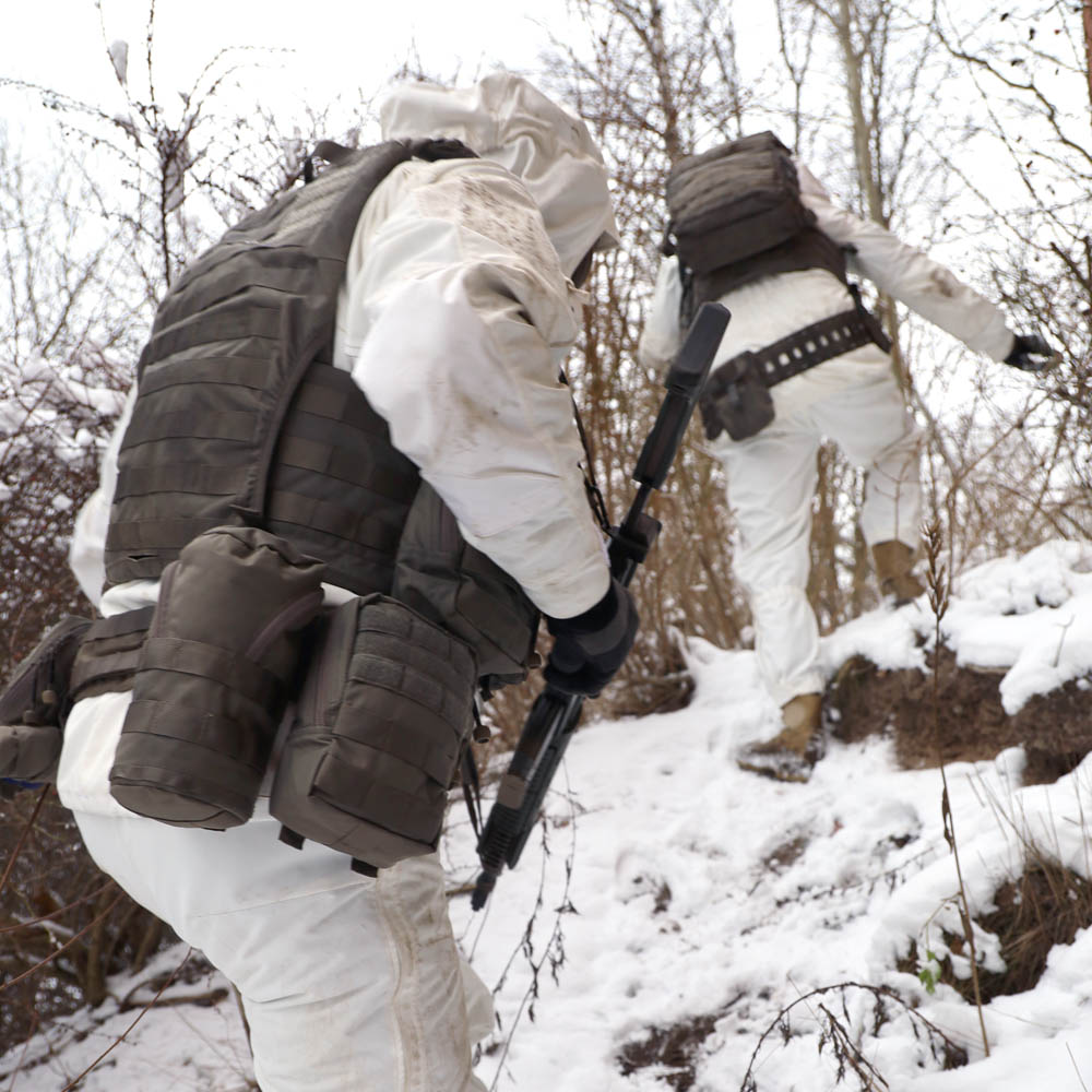 - Vikbart fästsystem gör det möjligt att fästa påsen på vilken modern utrustningsväst eller bälte som helst, vertikalt eller horisontellt.