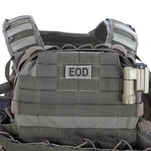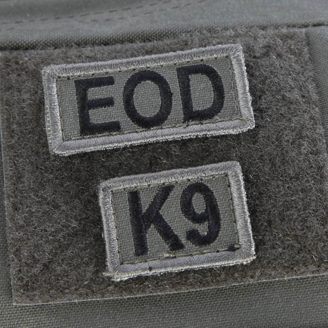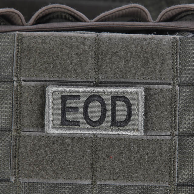En grå och svart patch med texten EOD, Explosive Ordnance Disposal.