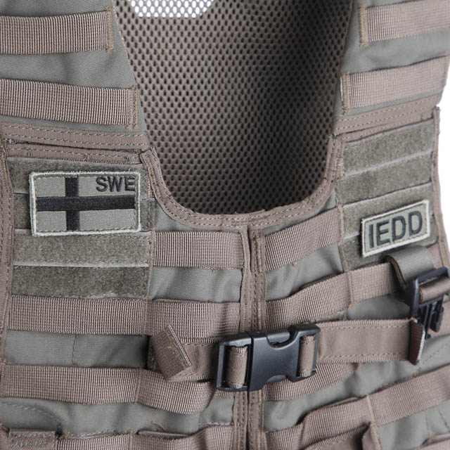 Kardborre ytan på baksidan gör så att märket kan fästas på kardborre ytor på väska och väst.
