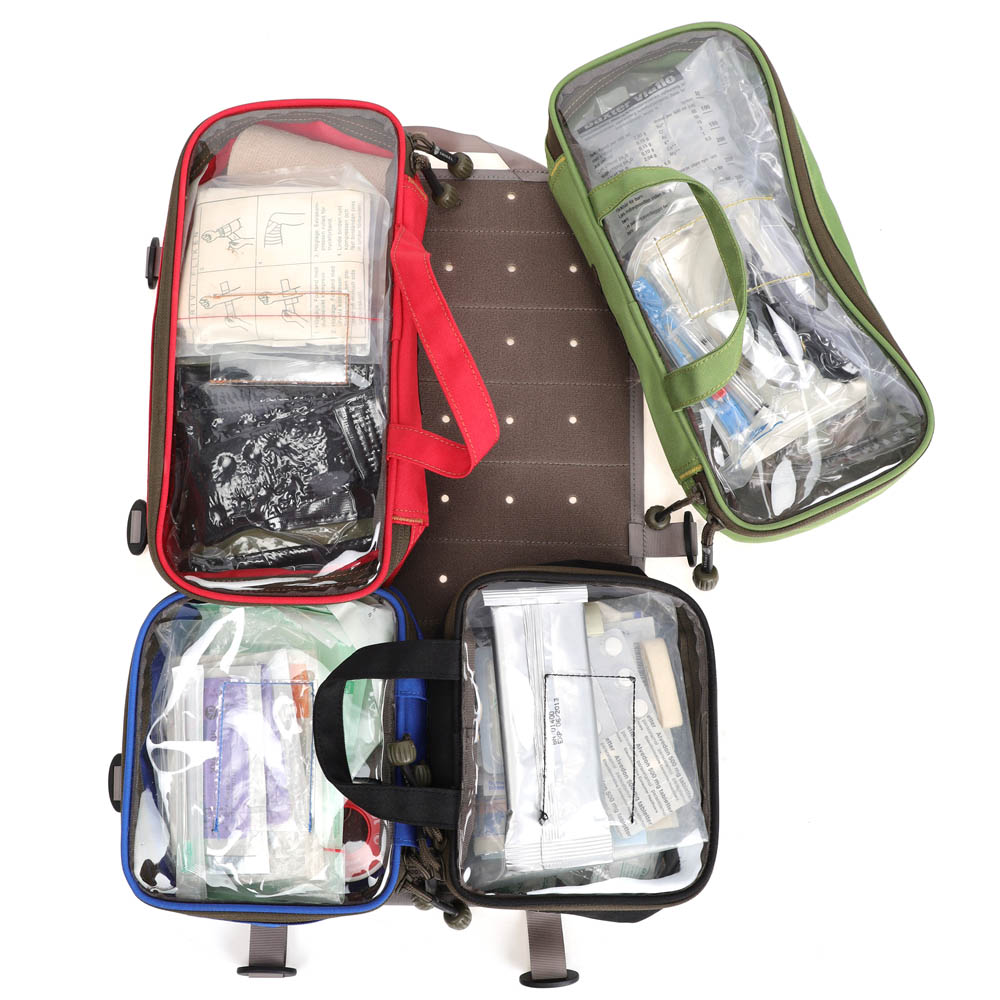 - Hål är stansade i Multi-insatspanelen där elastiska snören kan träs för att säkra föremål. Åtta elastiska snören ingår i Multipanelen
