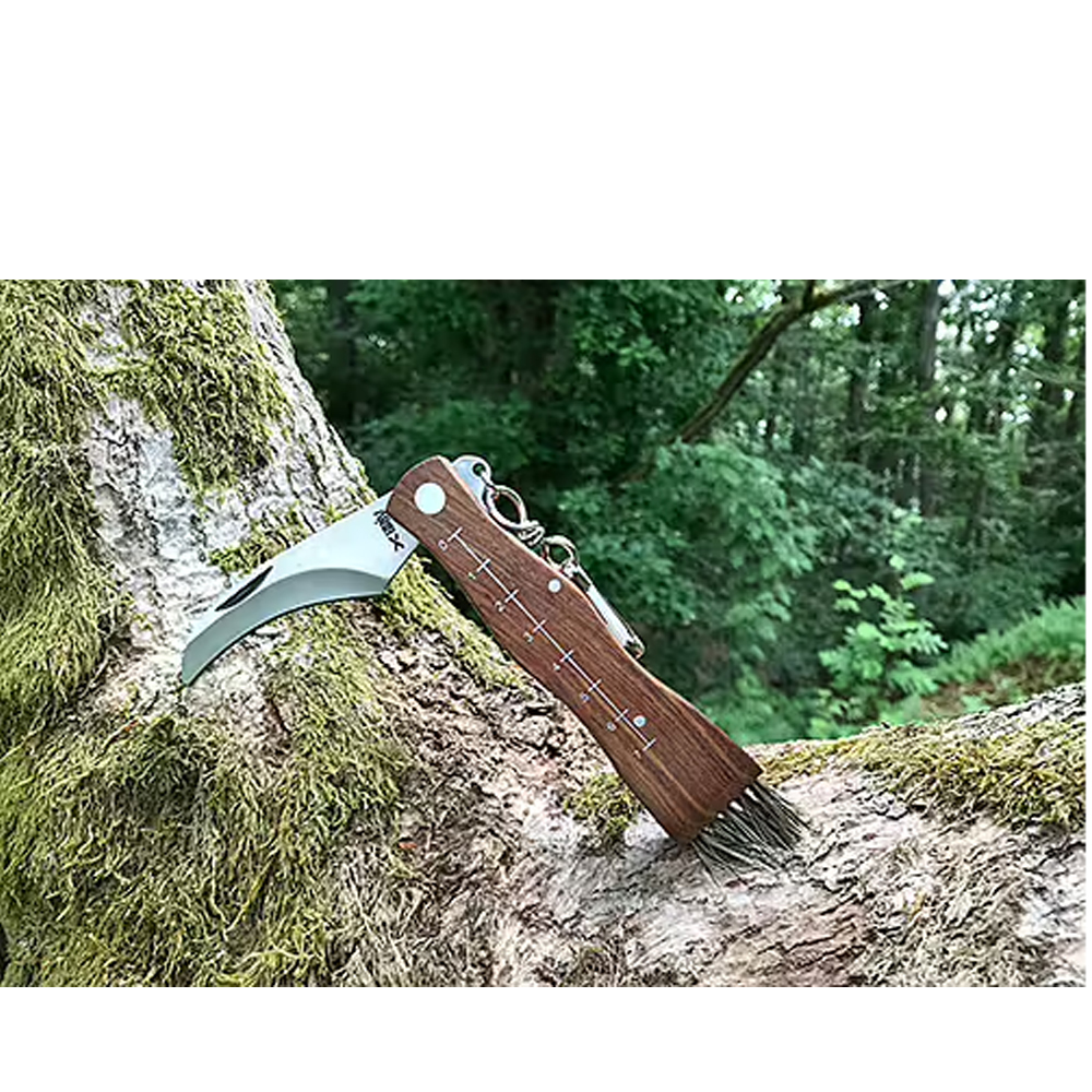 Denna populära svampkniv är ett oumbärligt verktyg för alla svampplockare. Den har ett ergonomiskt träskaft med ett vikbart knivblad och en borste för att enkelt avlägsna jord och skräp från svampen. En praktisk mätskala på ena sidan gör det enklare att bedöma svampens storlek. Kniven är utrustad med en kedja och en liten karbinhake för att hålla den nära till hands under dina svampäventyr. Med sitt vassa knivblad och smarta design är detta ett måste för både nybörjare och erfarna svampplockare. Kom ihåg att förvara kniven utom räckhåll för barn.