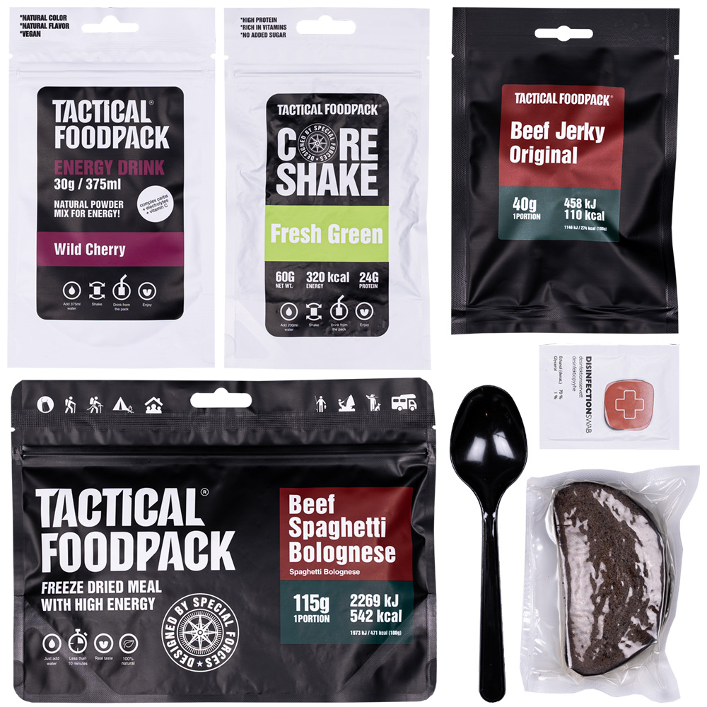 I ransonerna ingår en Tactical Foodpack-måltid, olika snacks och en energidryck. Det ingår även en sked, en taktisk drickskopp och en desinficerande handrengöringsservett. Ransoneringspåsen är återförslutbar. Tactical Foodpack är den bästa frystorkade maten för camping, vandring och utomhusäventyr.