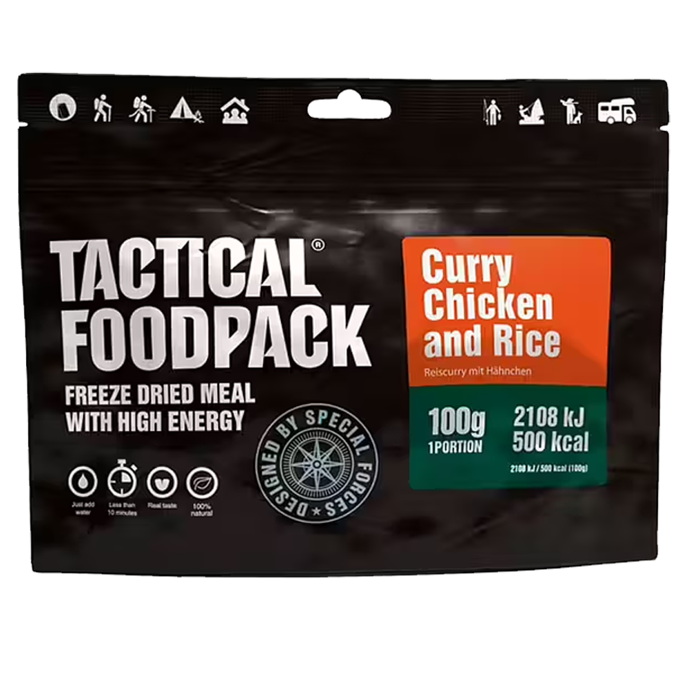Tactical Foodpack Curry Chicken and Rice är krämig curry med måttlig kryddighet. Om du vill ha en kryddigare rätt, tillsätt lite mindre vatten. 100% naturlig, utan konserveringsmedel och tillsatser. Tactical Foodpack är den bästa frystorkade maten för camping, vandring och utomhusäventyr. Ingredienser: ris (40%), kycklingfilé (17%), grädde, kycklingbuljong, rapsolja, tomater, paprika, currypasta, örter, kryddor, salt. Kan innehålla spår av selleri och senap.