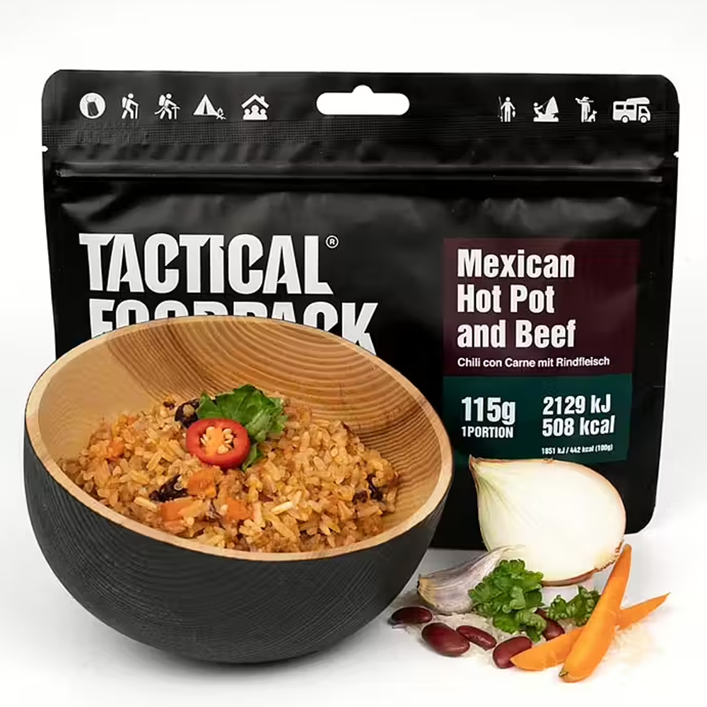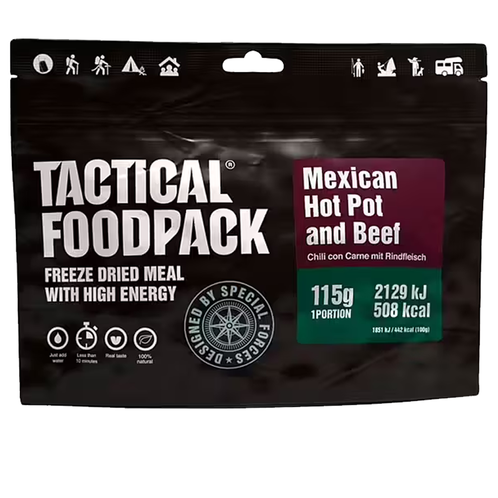 Tactical Foodpack Mexican Hot Pot and Beef är en är en av de rätter som tog oss lite mer tid att förbereda, men äntligen är vår kryddigaste rätt här. Den är kryddig och supergod, så att dela den med någon är inte ett alternativ. Denna vill man ha för sig själv. Tactical Foodpack är den bästa frystorkade maten för camping, vandring och utomhusäventyr.