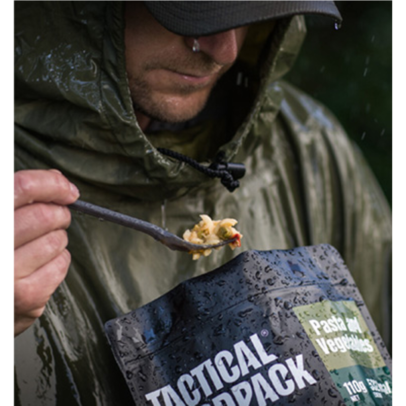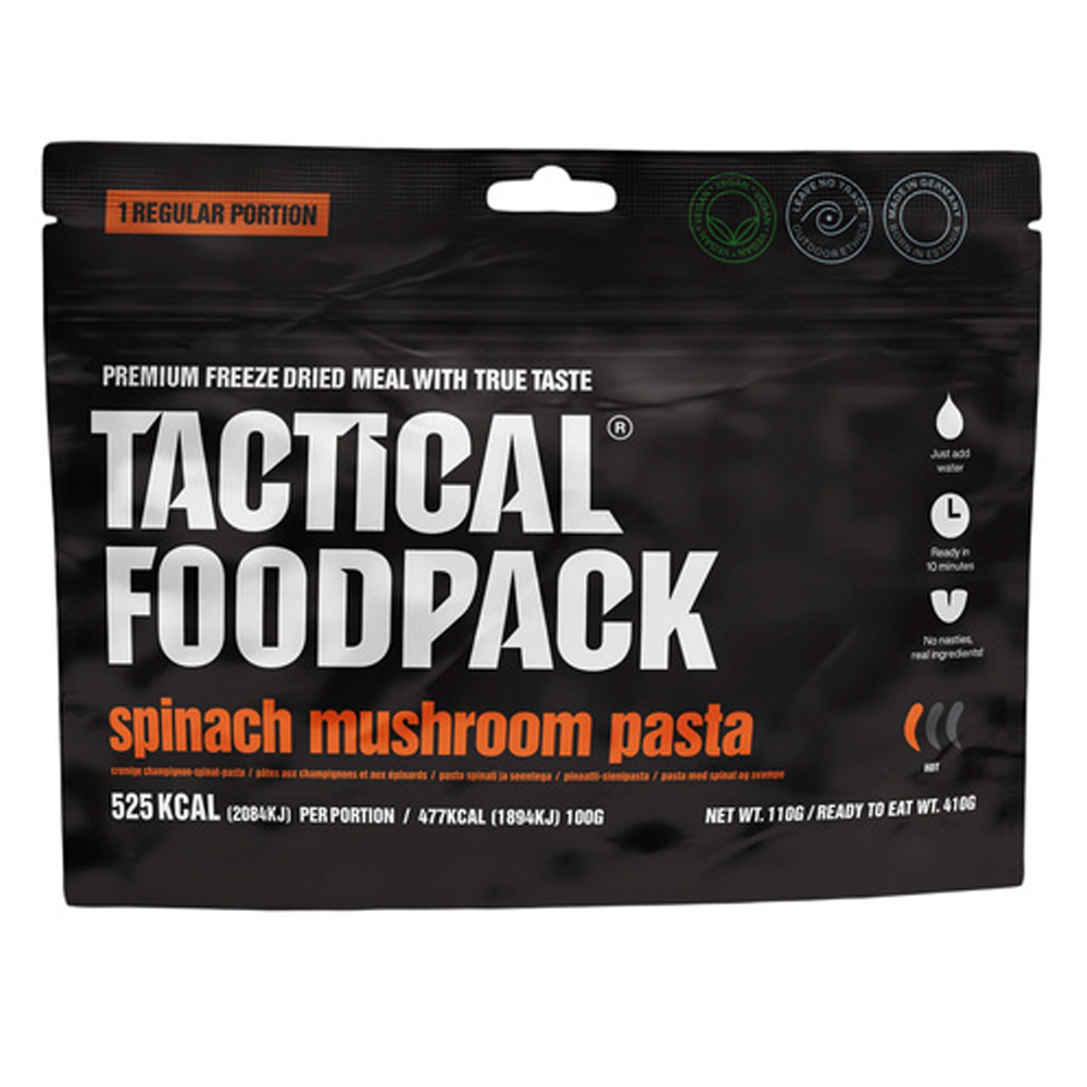 Tactical Foodpack Spinach Mushroom Pasta är en frystorkad, vegansk rätt med lyxiga smaker av spenat, linguine och fyra sorters vilda svampar: champinjoner, ostronsvamp, maitake och shiitake. Den lena havregrädden ger en krämig konsistens och rätten är kryddad med vitlök, peppar och ett stänk chilipulver.