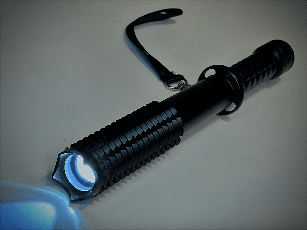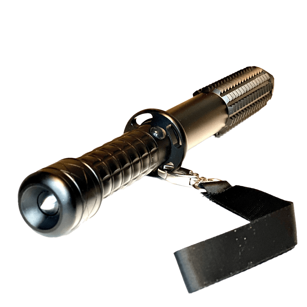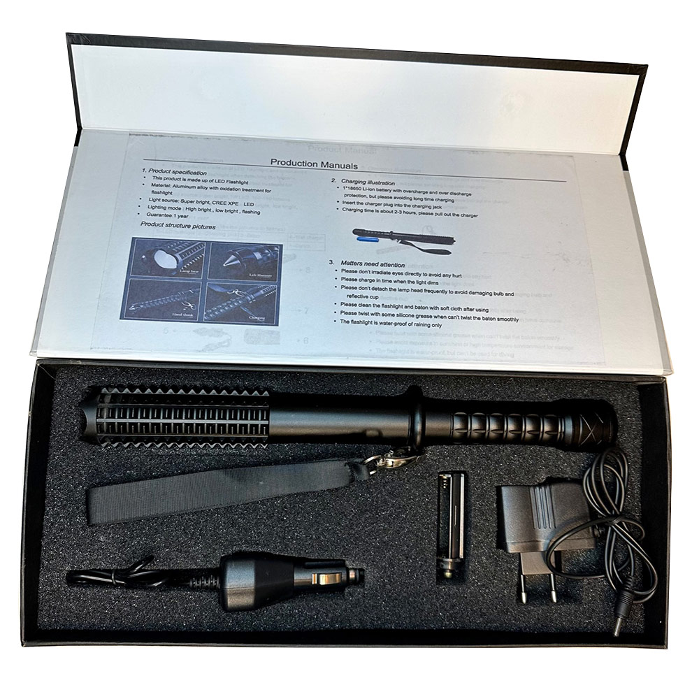 SjälvförsvarTaktisk laddningsbar LED ficklampa med utfällbar batonggrepp.