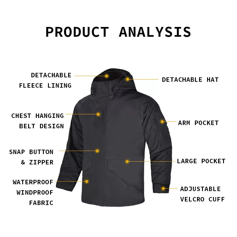 Vinter jackan är packad med goda praktiska lösningar, såsom den robusta dragkedjan, fickorna med knapplåsning, varm huva samt tjockt bomullsmaterial. Om du söker en jacka med flera lager som man kan ta bort, är detta arketypen av en taktisk vinter jacka som du kommer att ha användning för många säsonger framöver!