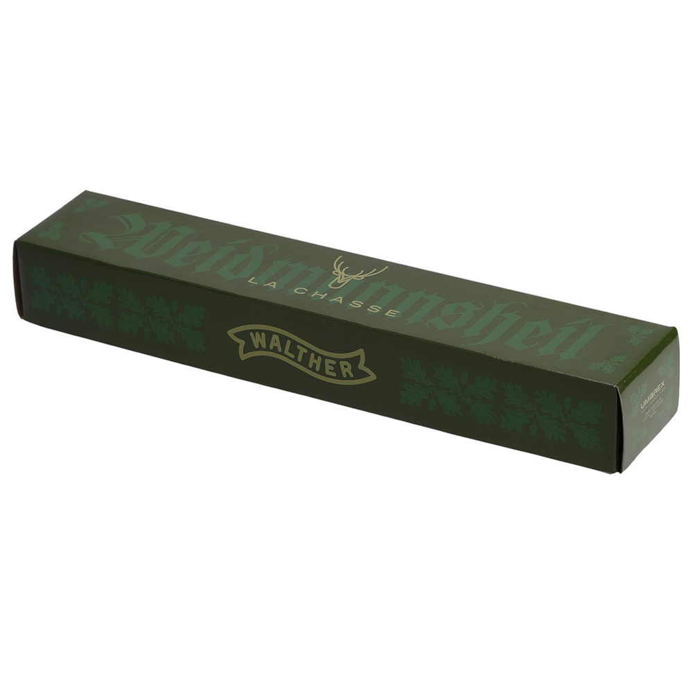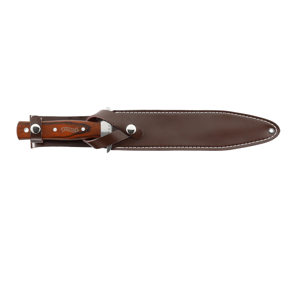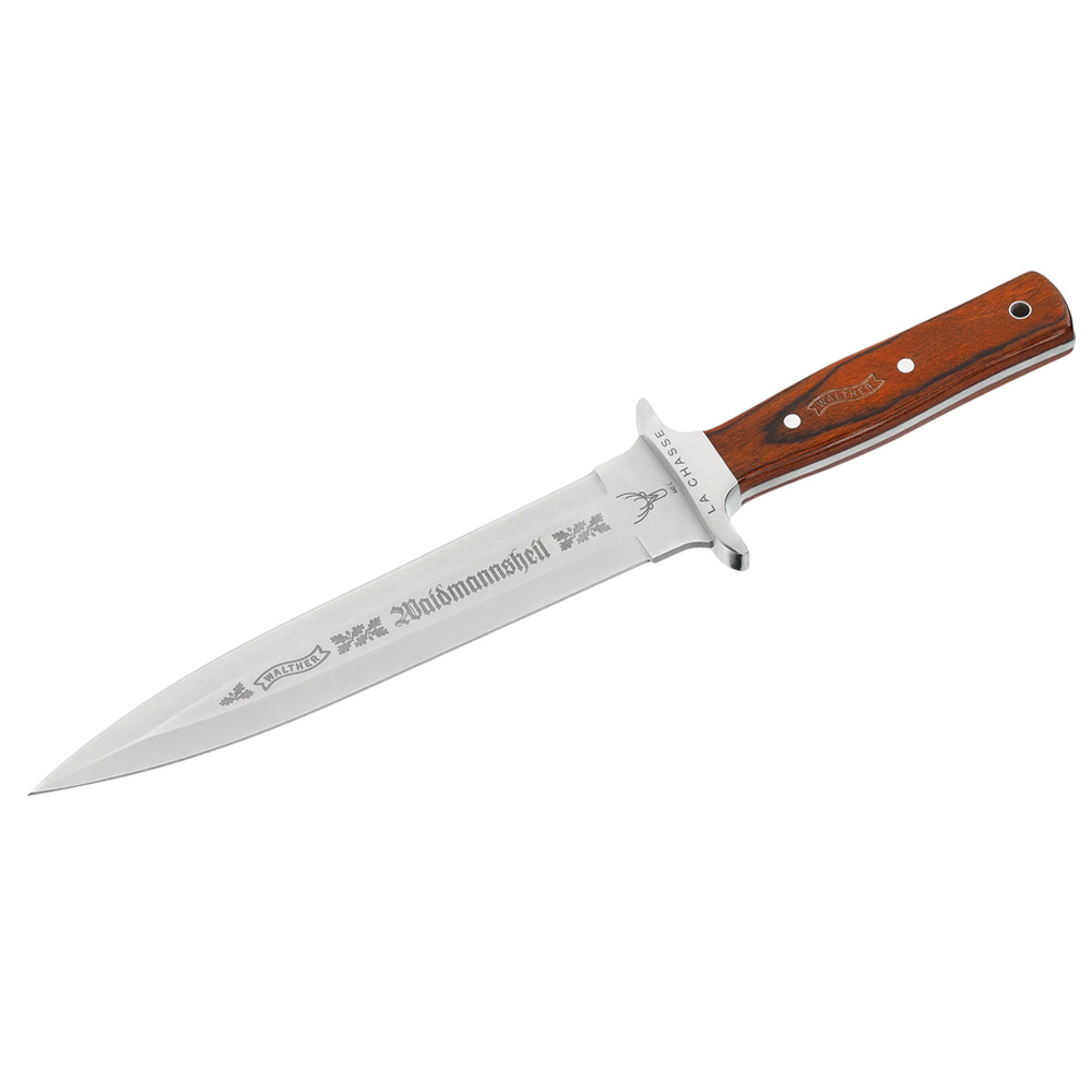 Jägare har höga krav när det gäller vildsvinsknivar som Walther La Chasse. En välplacerad stöt krävs för att få jobbet gjort snabbt. Därför har den här kniven ett blad som är nästan 240 mm långt och 40 mm brett, plus en blodränna. Mellan bladet och handtaget bär stålhandskyddet inskriptionen La Chasse – jakten. Boar Hunter kan enkelt bäras på bältet med det medföljande läderslidan.