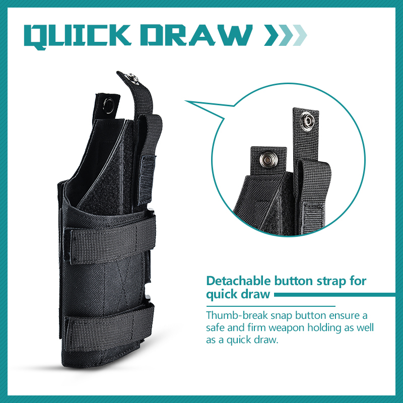 "Thumb-break snap button" säkerställer en säker och stadig vapenhållning samt en snabb dragning.