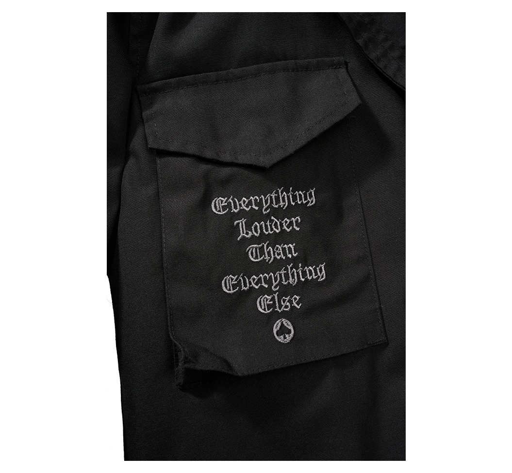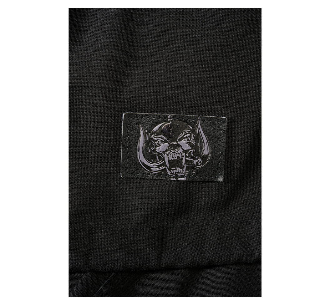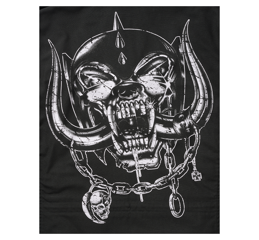 Motörheads logotyp pryder ena bröstfickan och på den andra finns texten "Everything Louder Than Everything Else". I nederkanten finns en läderpatch med Warpig.