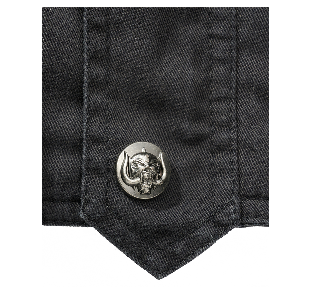 På bröstet finns en avtagbar Motörhead-pin. En annan snygg detalj är att alla tryckknapparna har Warpig huvud som sticker ut från metallen.