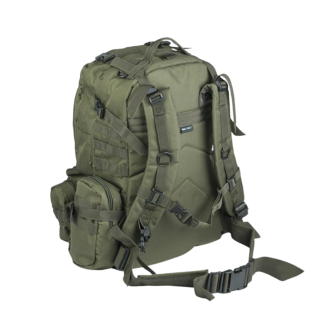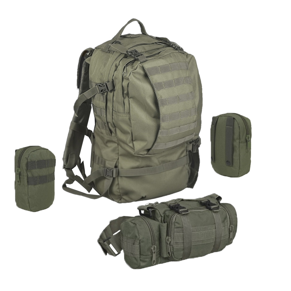 - Flera Molle-öglor på ryggsäck, sidfickor och höftväska