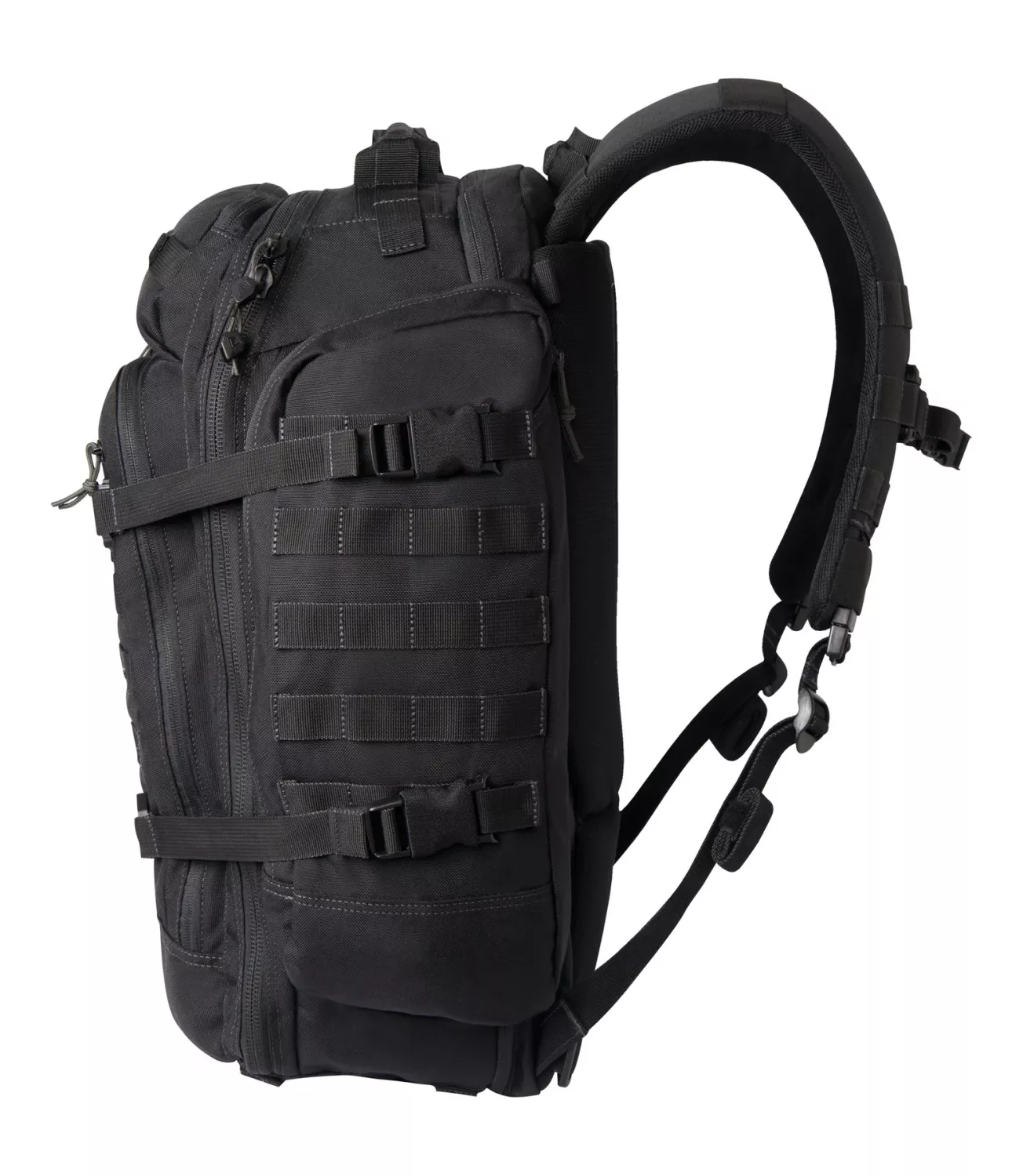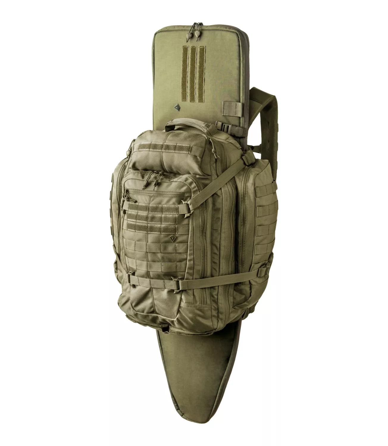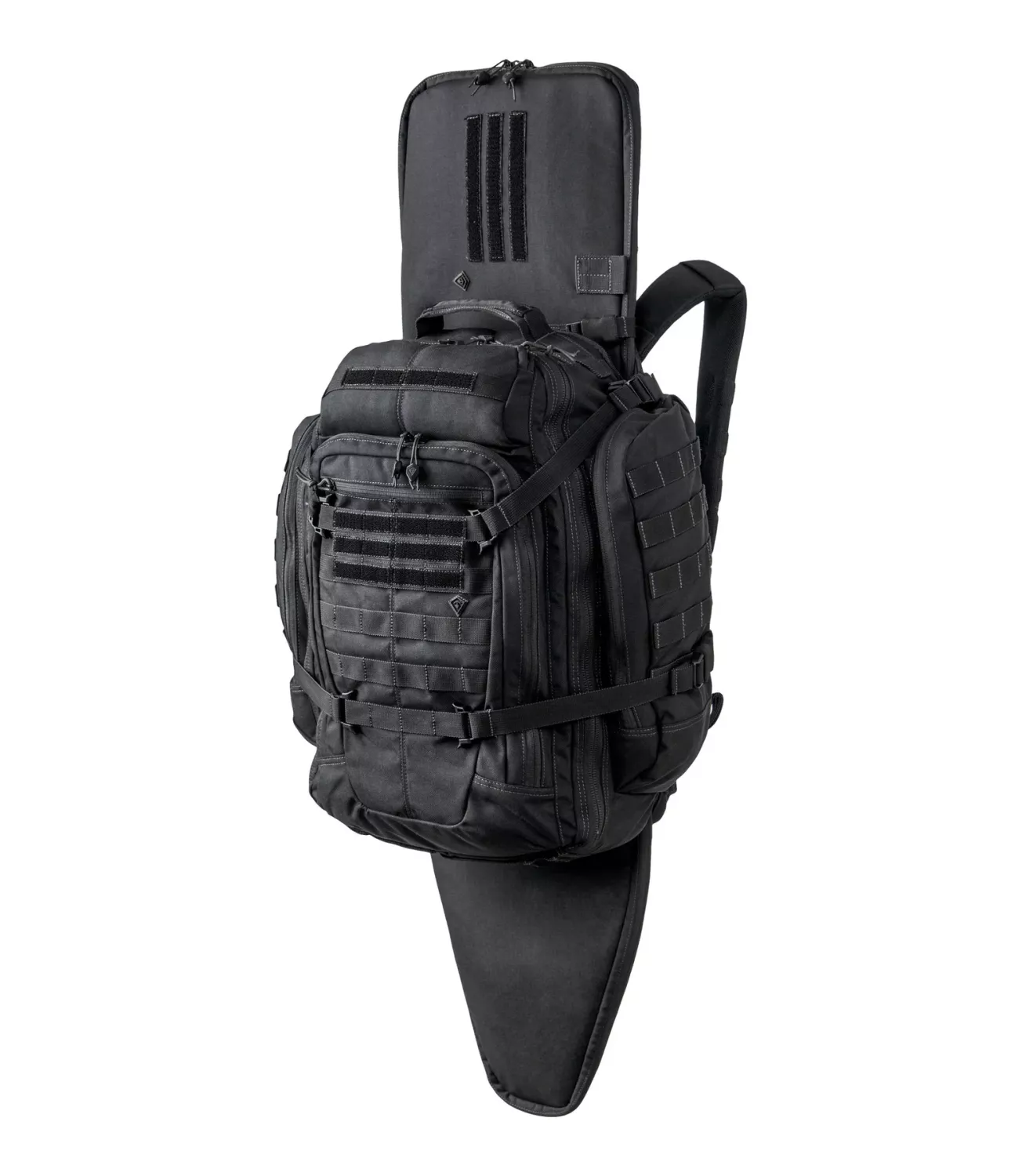 All of First Tactical's Backpacks feature our ingenious Hook and Hang Thru™ System, allowing users to slide our Rifle Sleeves along the back of the pack for hand-free and secure weapons transportation.