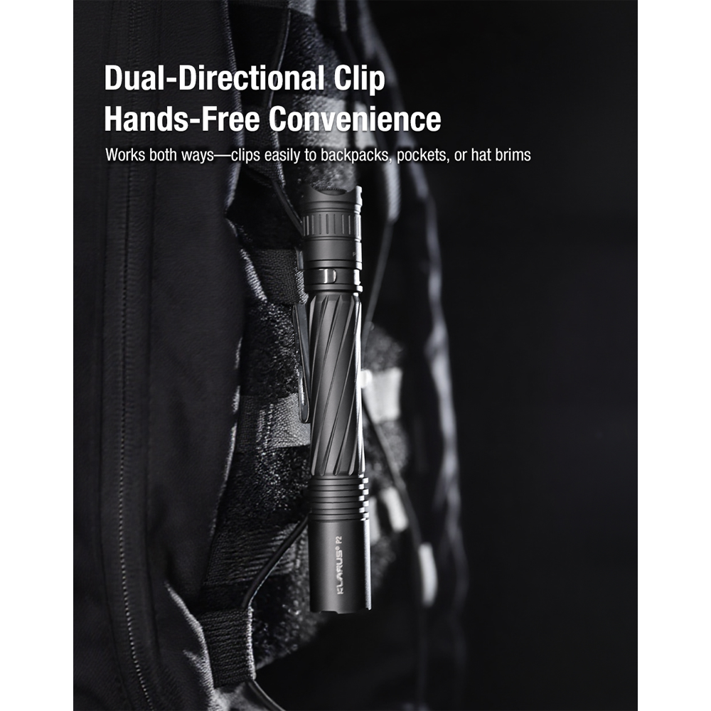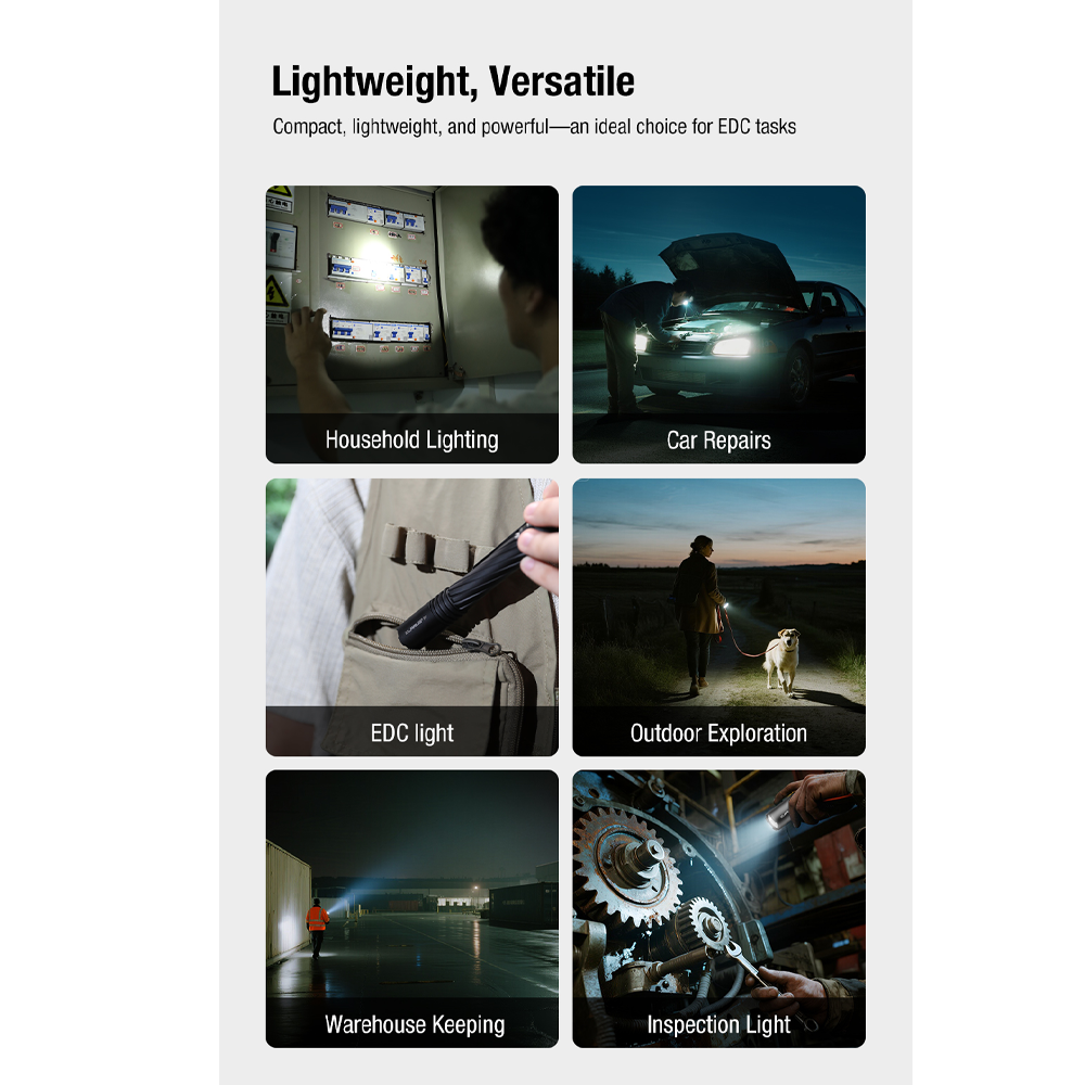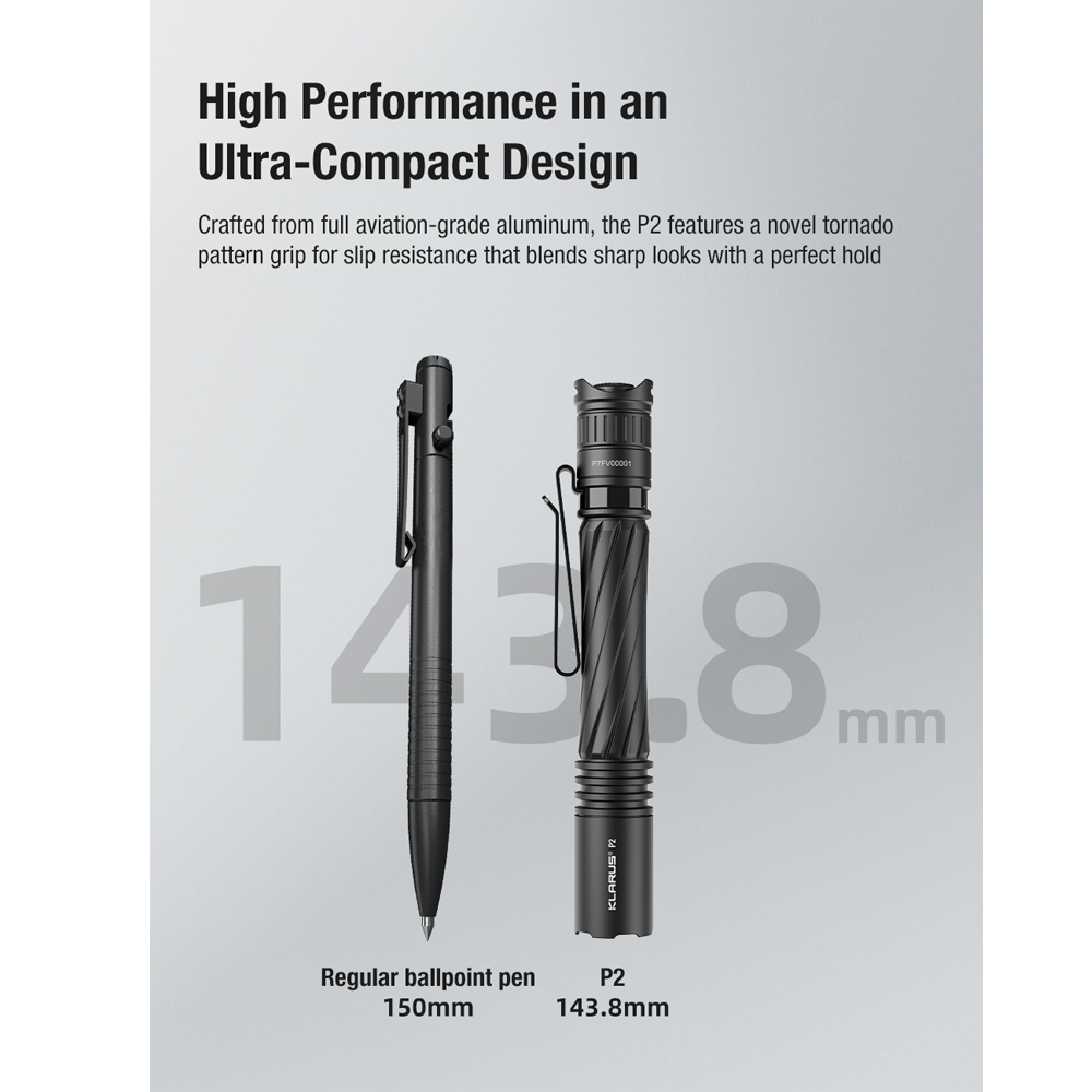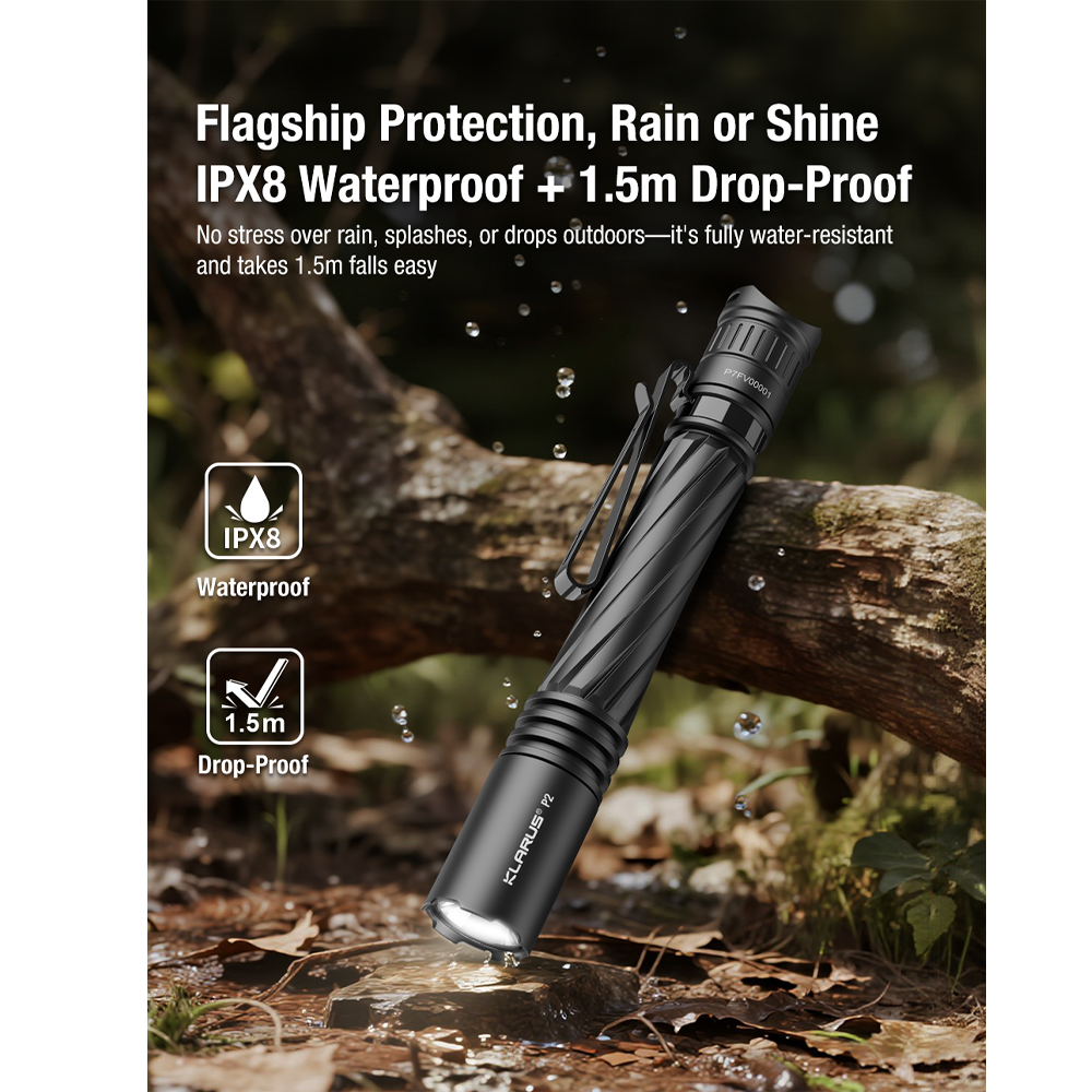 Med IPX8-vattentålighet, 1,5 m slagtålighet och låg vikt är P2 en pålitlig EDC-ficklampa som klarar tuffa miljöer utan att kompromissa med prestanda.