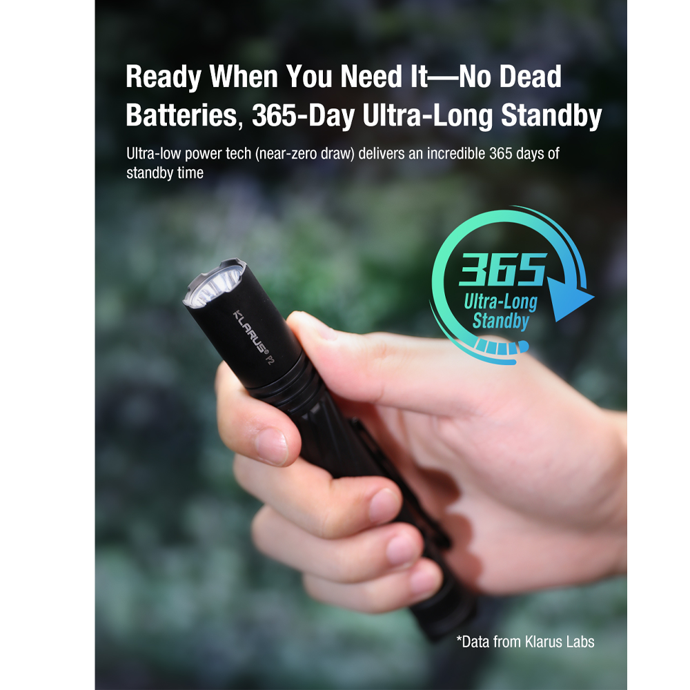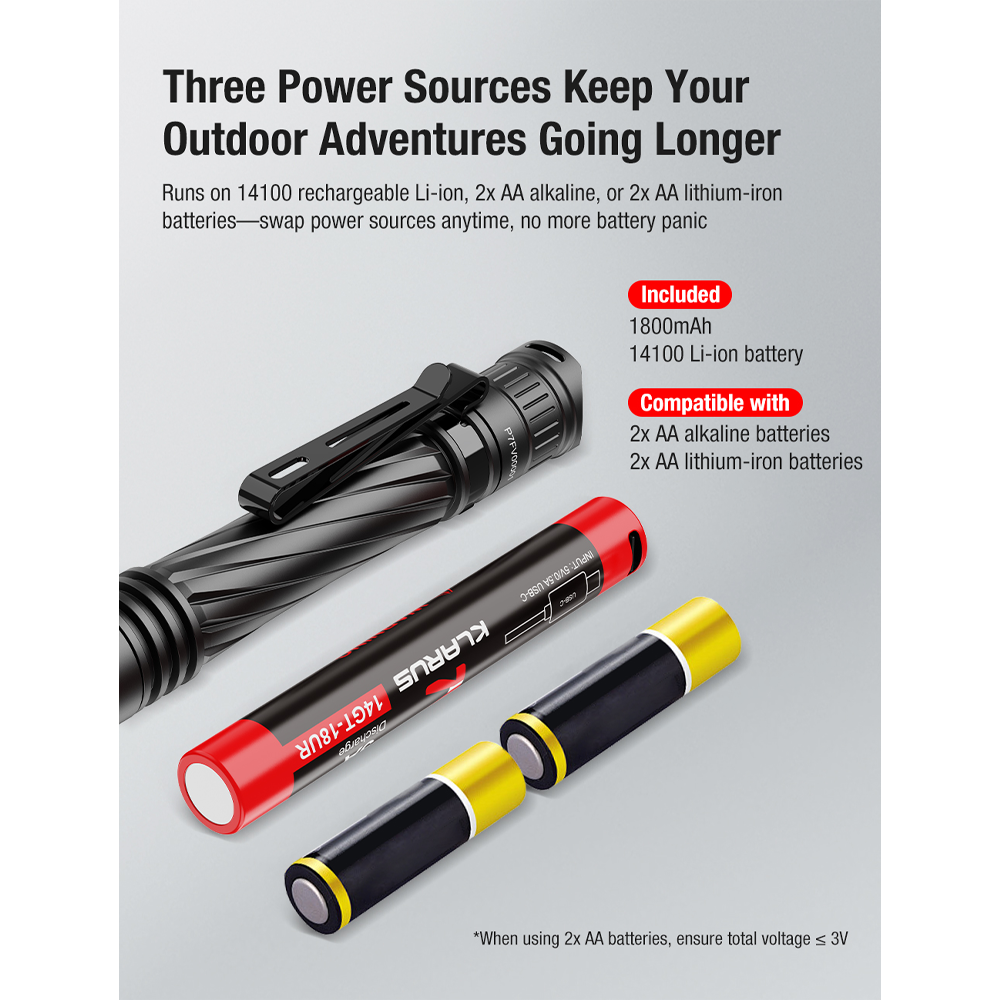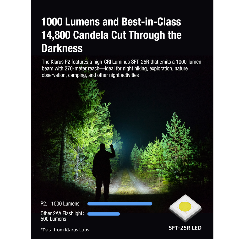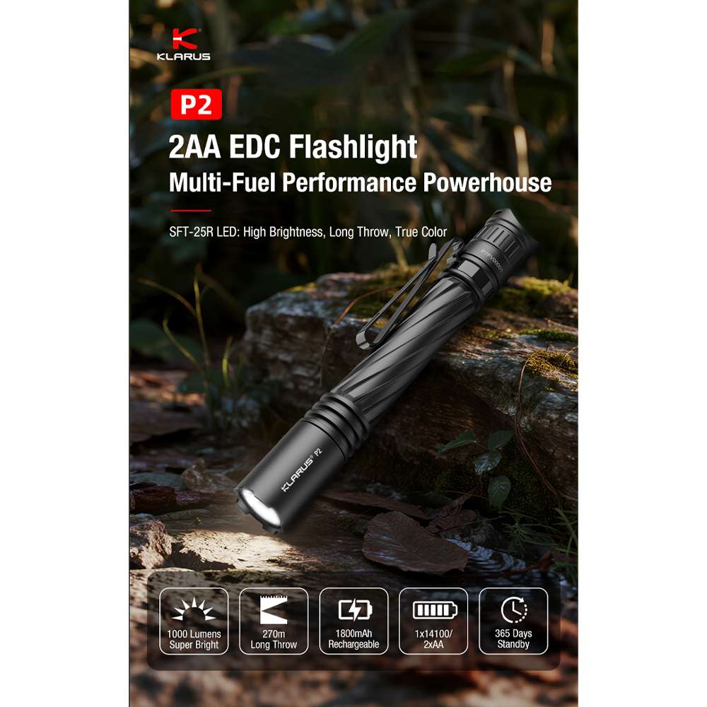 KLARUS 2AA EDC Ficklampa P2 – 1000 Lumen, 270 m Räckvidd, Multi-Fuel, IPX8.