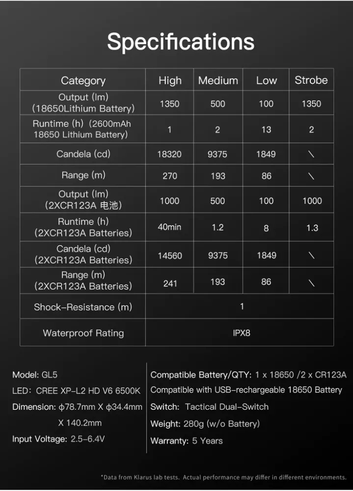 Klarus GL5 1350 Lumen Vertical Tactical Foregrip Flashlight