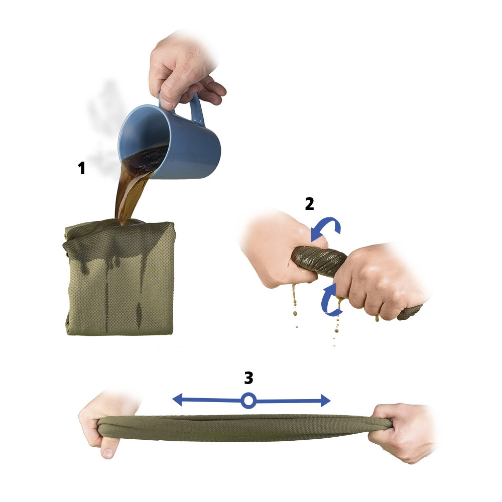 Blöt handduken, vrid ur överflödigt vatten och skaka den kraftigt. Kraften i skakningen aktiverar handdukens kylande funktion. Nu ger handduken dig en svalkande omfamning utan att droppa eller kännas obehagligt blöt, och även varmt vatten och svett kan förvandlas till svalka. Skulle kyleffekten avta är det bara att skaka kylhandduken igen för att aktivera funktionen på nytt. Handduken kan återanvändas i all oändlighet och proceduren upprepas så fort kyleffekten önskas. Till råga på allt fungerar den även som skydd mot solen och passar perfekt när UV-strålarna tagit hårt på dig efter första sommardagen.