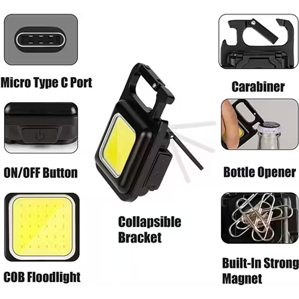 Denna smidiga minilampa med COB/LED-dioder levererar upp till 300 lumen i ett kompakt format. Med karbinhake, magnet och inbyggt stöd kan den enkelt fästas eller placeras där ljus behövs. Lampan är dessutom utrustad med flasköppnare, vilket gör den perfekt för camping, friluftsliv och vardagsbruk. Laddas enkelt via USB-C och är så lätt att du kan bära den överallt.