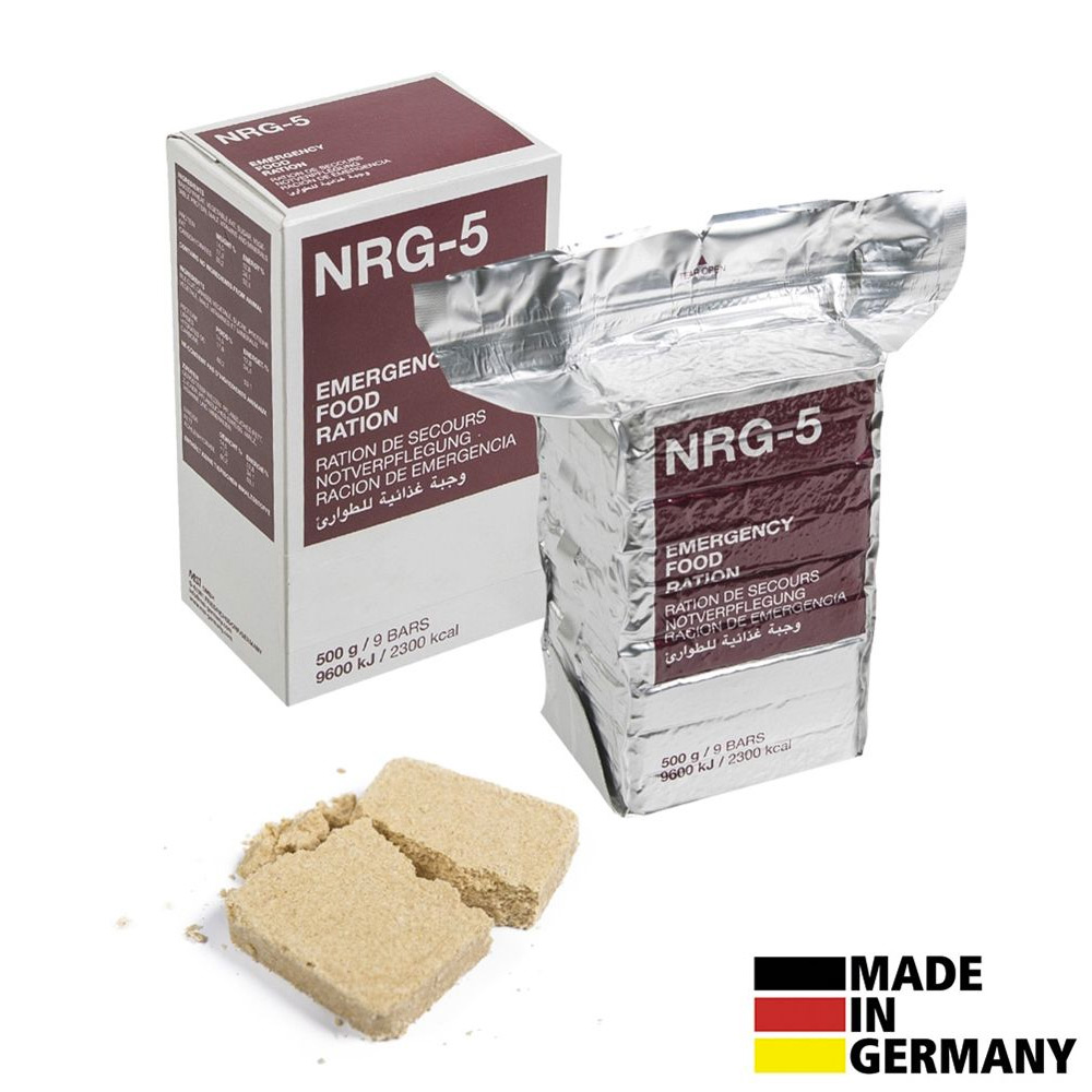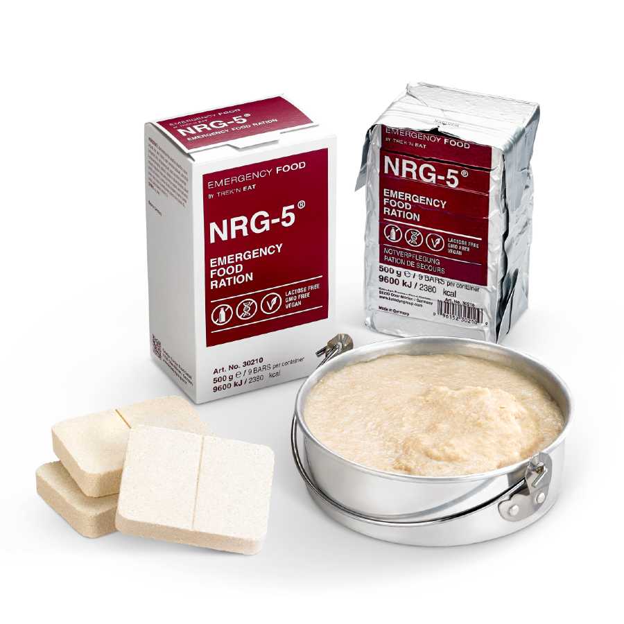 Ett paket NRG-5® innehåller 9 st kakor (500g / 2300 kcal) täcker en daglig vuxens energikrav. Klar att äta, ingen uppvärmning eller kokning krävs. Kan ges till barn från 6 månader. Genom att krossa de komprimerade stavarna och tillsätta vatten kan du förbereda en näringsrik mos eller en energidryck, beroende på hur mycket vatten du tillsätter.