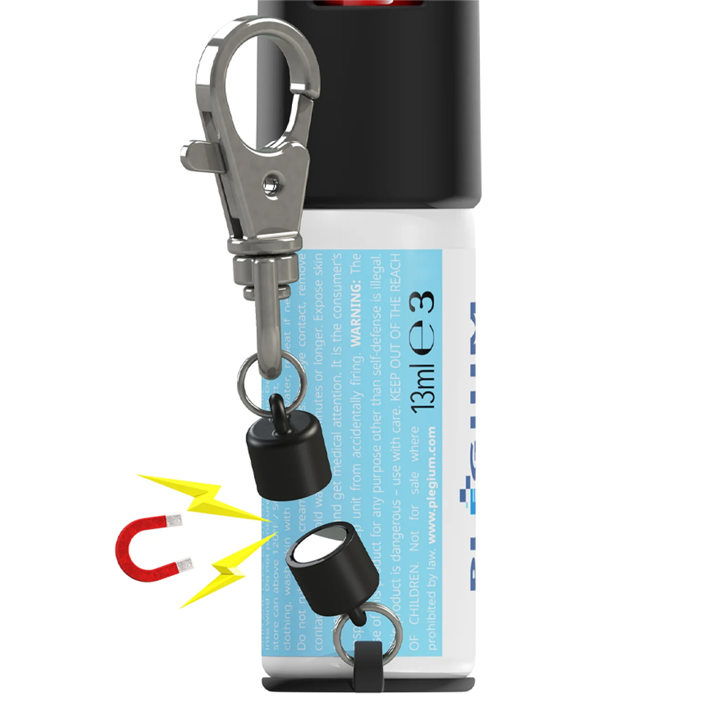Sprayen har vridsäkring för säker hantering, upp till 3 meters räckvidd och innehåll som räcker till flera angripare. Den magnetiska, separerande nyckelkedjan gör att sprayen snabbt kan lossas från nyckelknippan och användas direkt när varje sekund räknas. Ett utmärkt val för personlig säkerhet i vardagen.