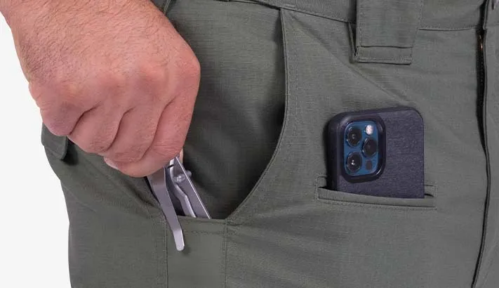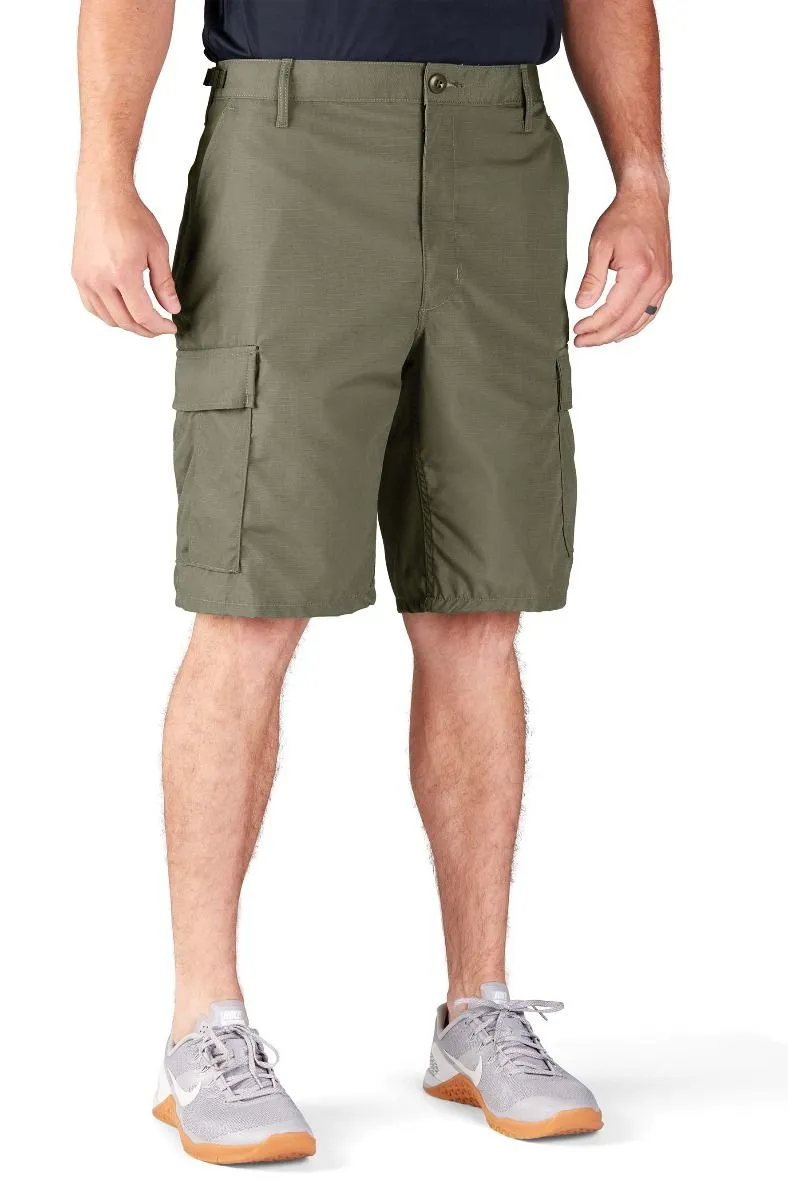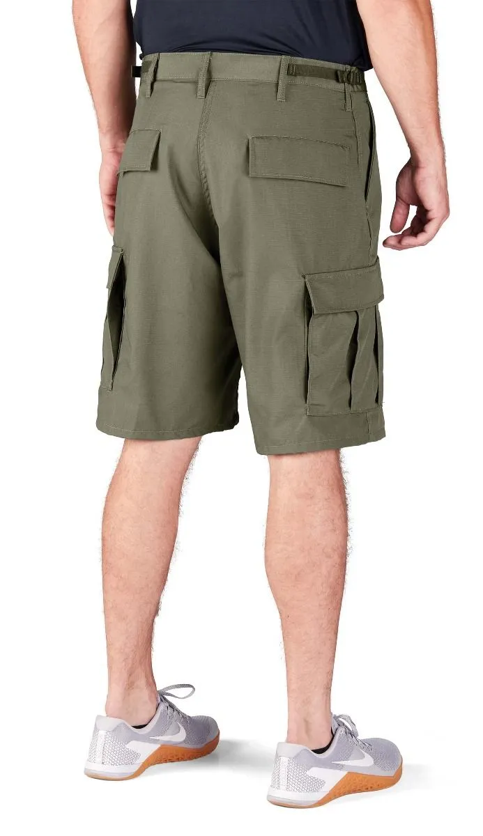 BDU-shortsen har sex fickor och ett justerbart 4" midjeband med spännstift för en säker passform. Shortsen har en gylf med dragkedja, sammans slagna fick-flikar, dräneringshål i bälgfickorna och fällda innersömmar, ytter sömmar och sätessömmar.