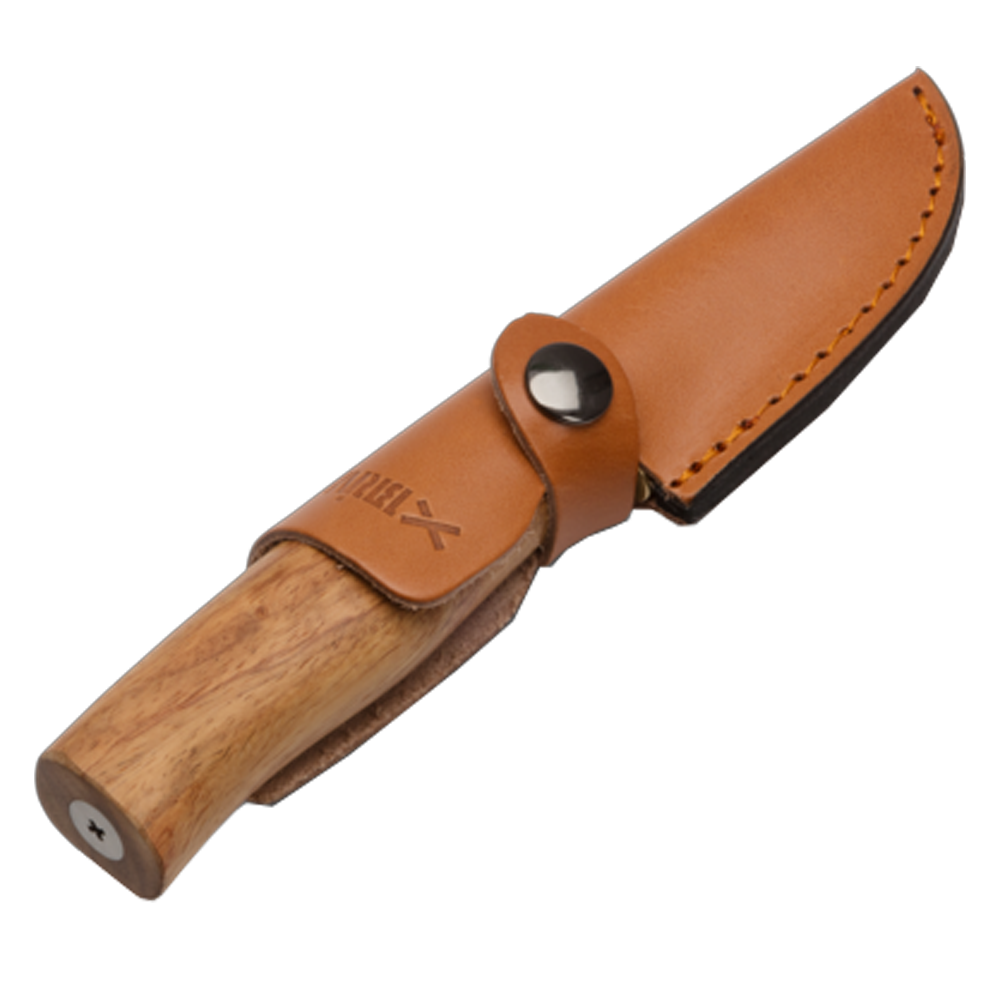 Kniven levereras med en vacker läderslida i naturfärg, vilket ger ett tidlöst och elegant intryck. Sarek-modellen passar perfekt för friluftsliv, jakt eller som ett värdefullt samlarobjekt.