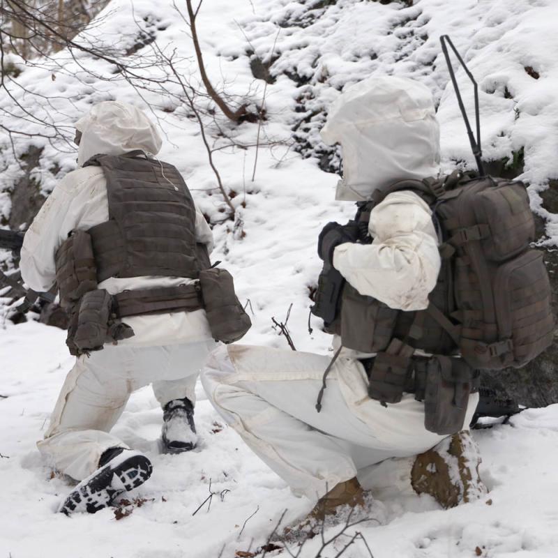 - MOLLE-banden sys på 8 cm breda MOLLE-paneler med slitsar mellan panelerna, så att det inre bältet kan vävas inuti eller utanför, beroende på om du vill ha MOLLE-montering eller remmontering för hölster och andra tillbehör.